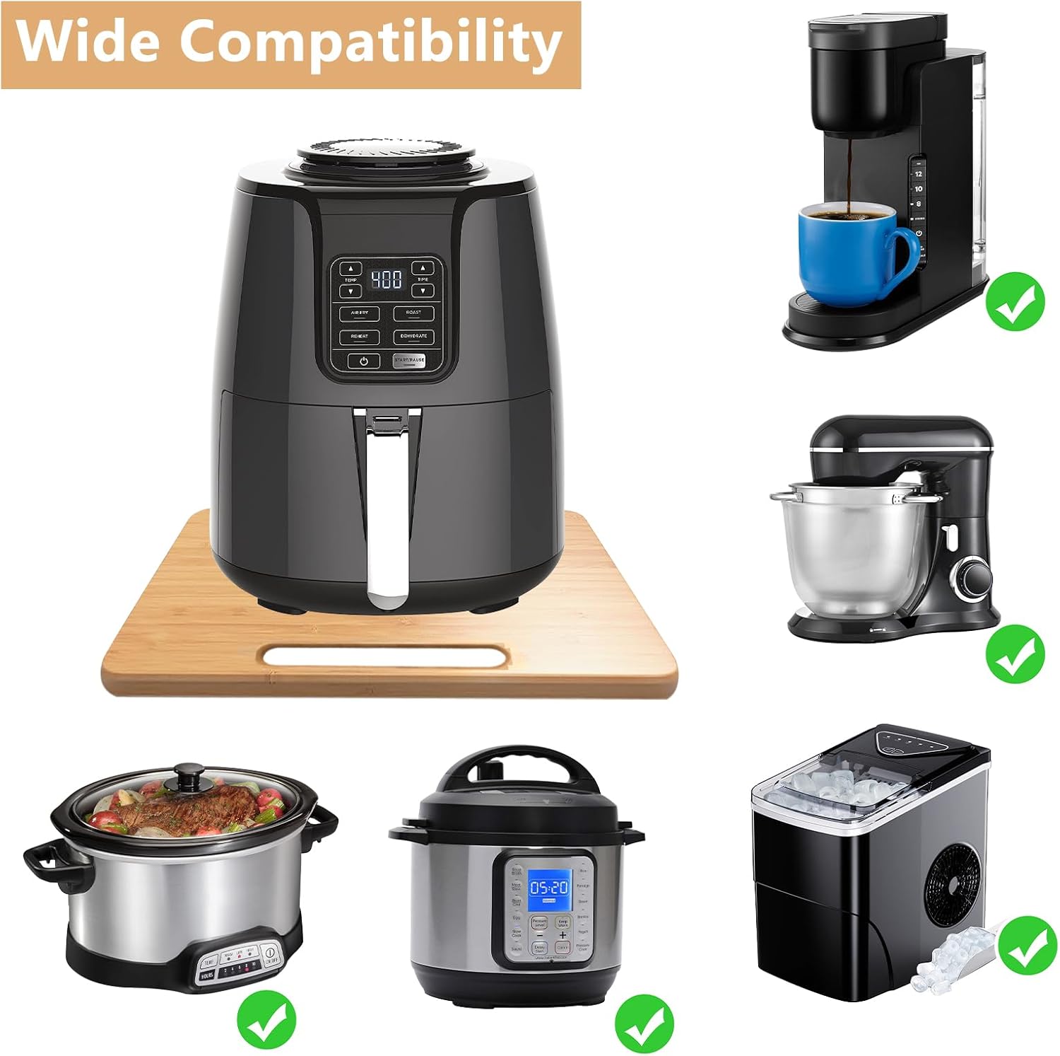 【Function 2 in 1 】This heat resistant mat is a 2-in-1 that can effectively insulate heat and act as a sliding mat. The quality thick bamboo air fry mat with 5 sliders helps you easily pulls your coffee pot or air fryer out from under the cabinet. Tips: The free 5 sliders needs to be sticked by yourself, just remove the slider sticker and then stick in position you need at the bottom of bamboo kitchen appliance sliding tray.