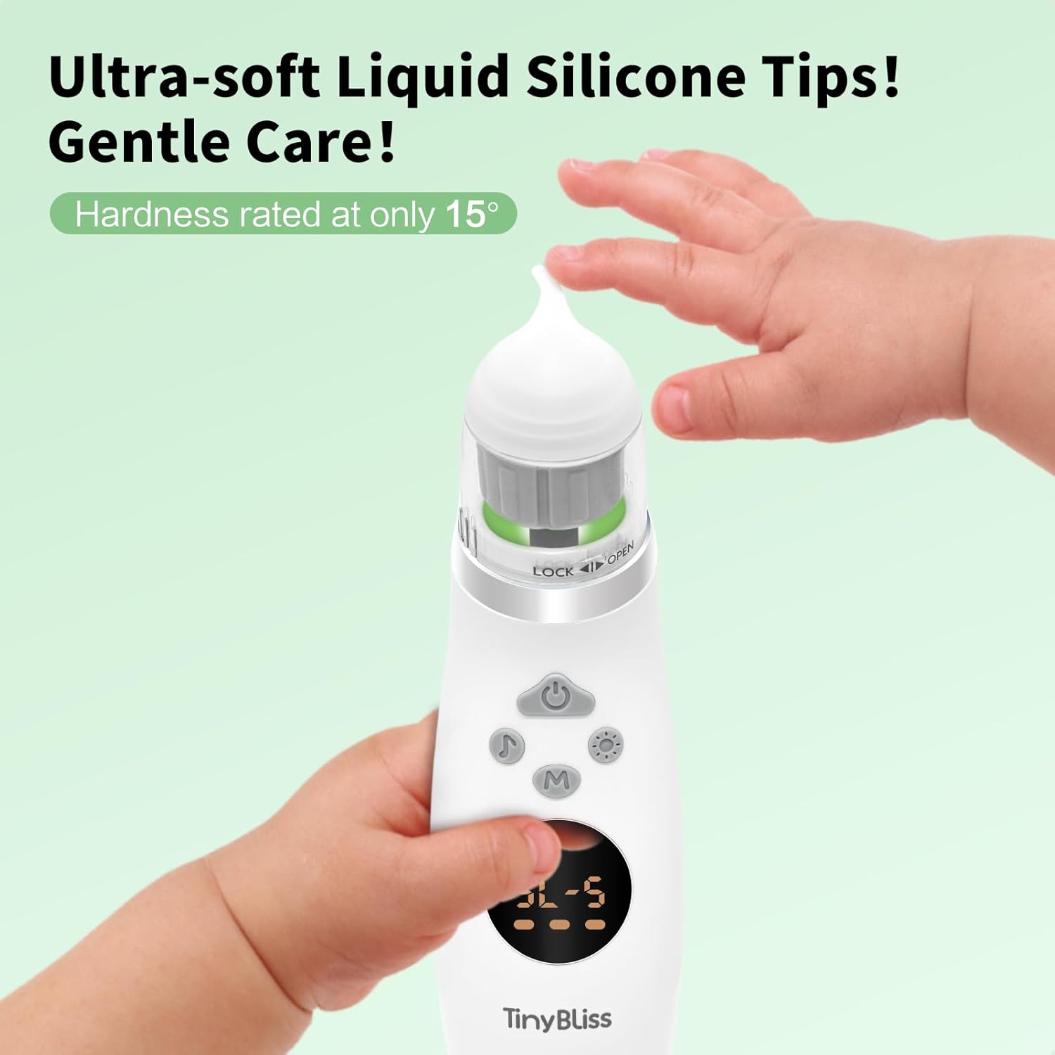 Powerful Suction: TinyBliss baby nasal aspirator features 5 levels of suction adjustment, reaching a maximum suction of 70kpa, outperforming other baby aspirators with 60kpa suction. Our nose sucker offers strong suction effectiveness, ensuring quick and thorough cleaning of various nasal mucus.