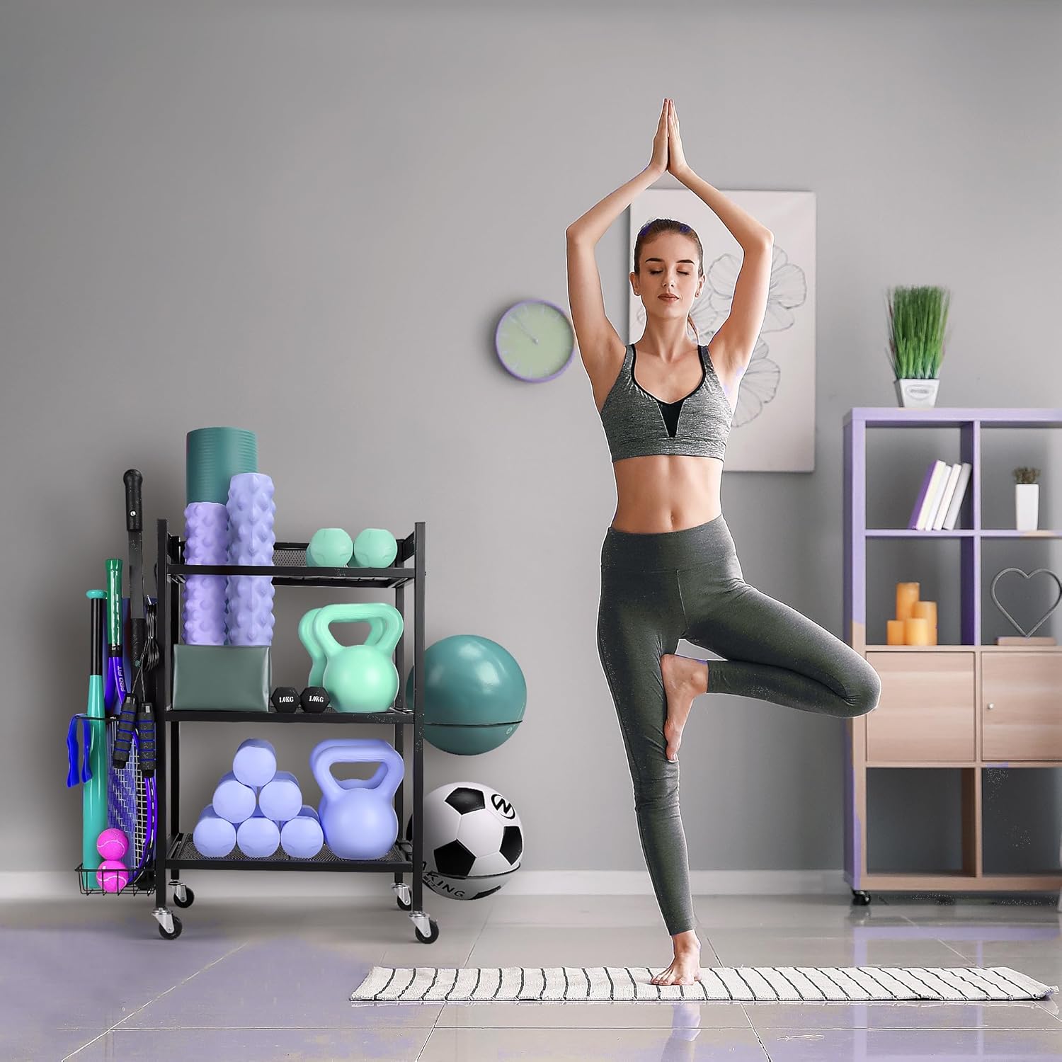 Home Gym Storage Racks,yoga mat storage Racks,Compact Storage Racks for Home Gym – Multifunctional Sports workout equipment storage for Garage, Indoor-Easy to assemble with swivel wheels.(Grey)
