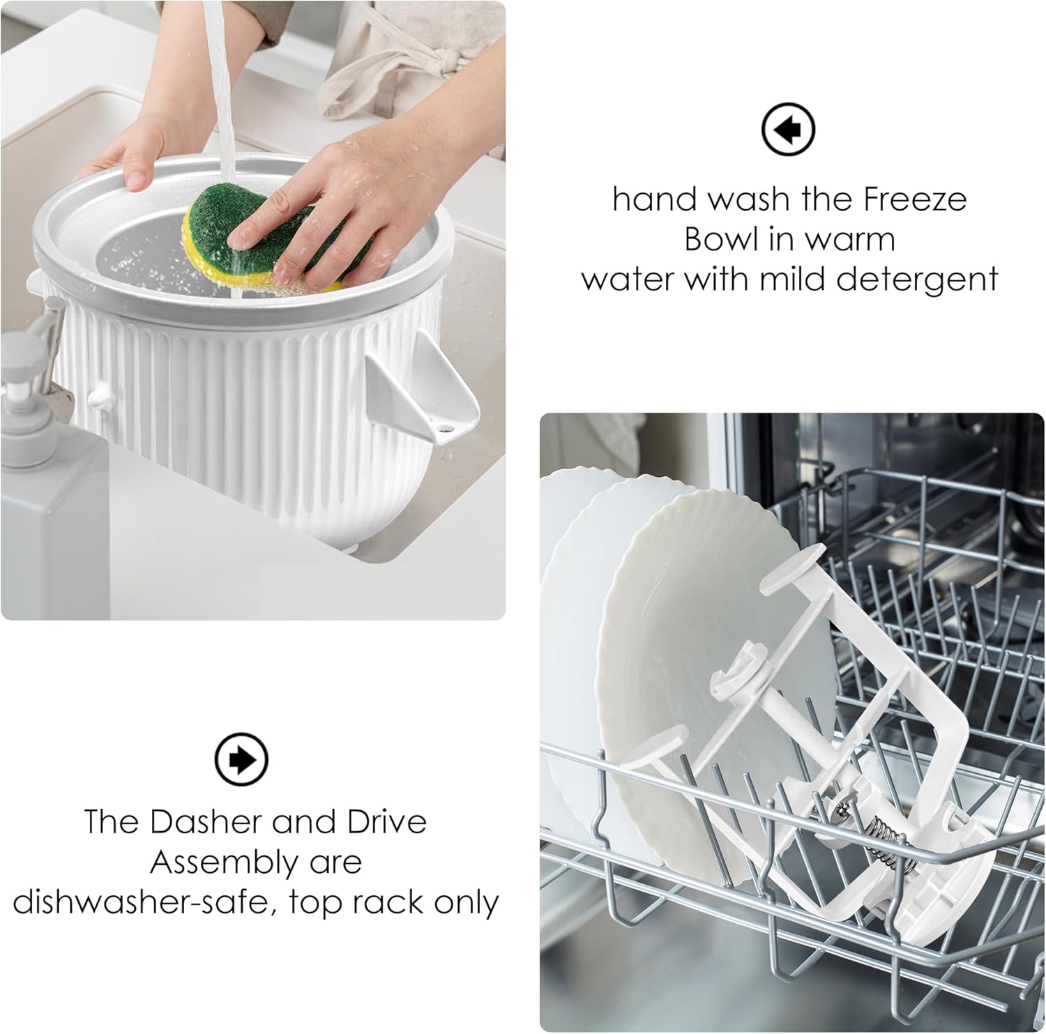 🍨【Easy to Clean】- The Freeze Bowl must be washed by hand in mild or cool water, not dishwasher-safe. (Freezer bowl must be thoroughly dried before placing it in the freezer or storing it.)