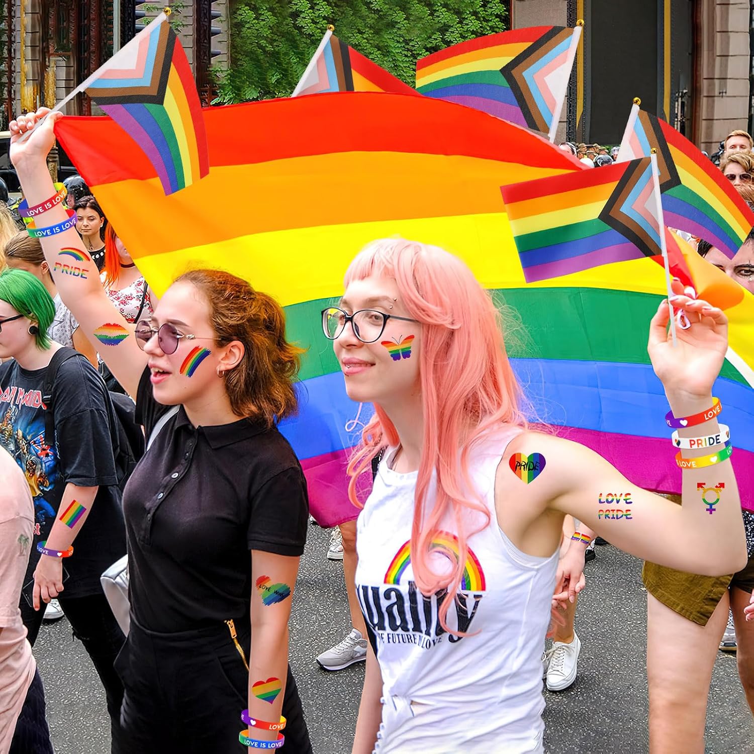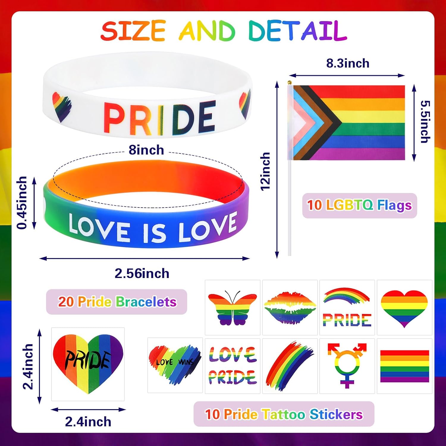 Diverse Pride Accessories Set: The pride accessories set includes 20 LGBTQ bracelets, 10 pride tattoo stickers, and 10 pride flags to meet your various needs during the Pride Month celebration, pride party favors allow you to fully showcase your self-identity