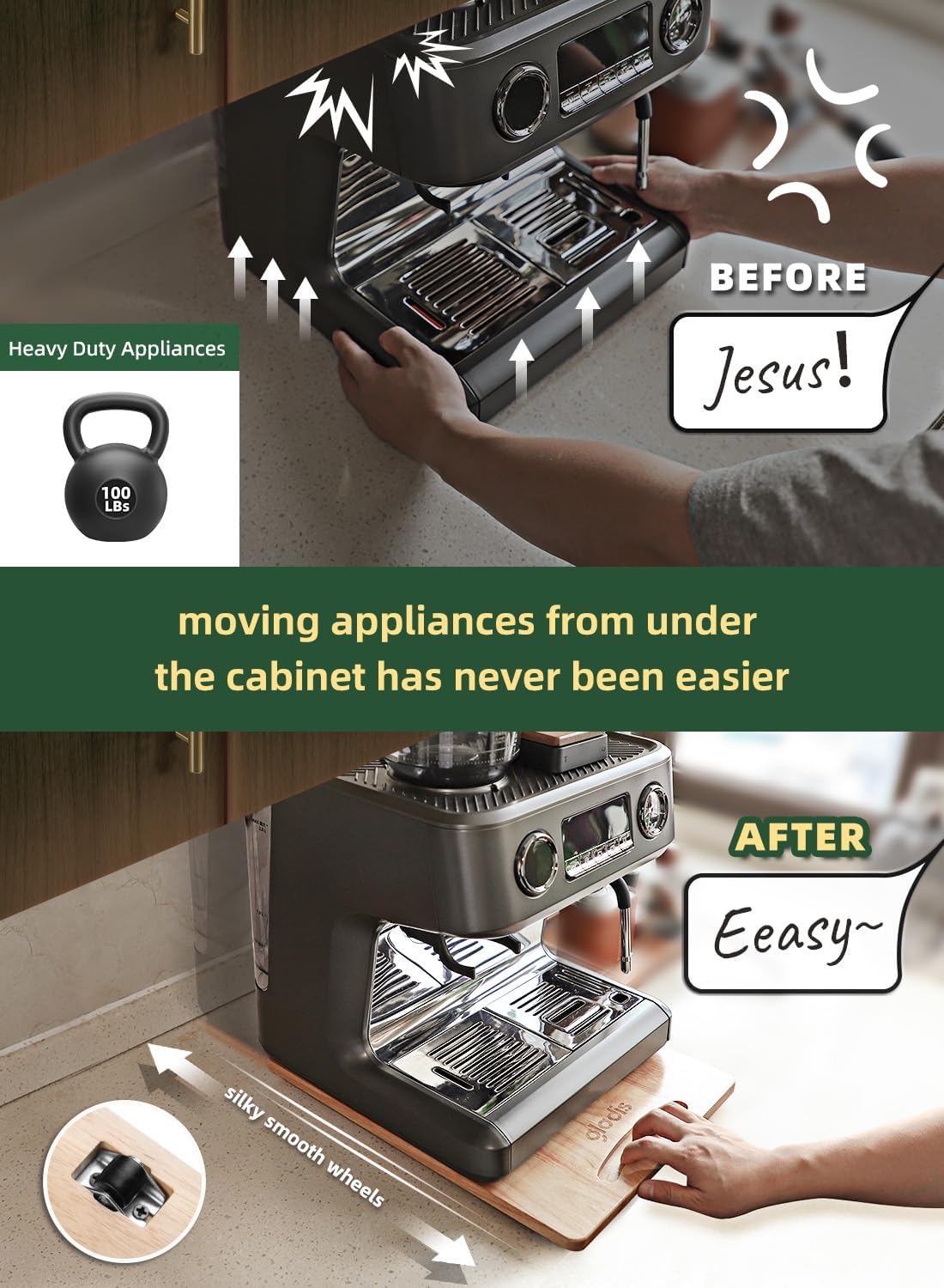 Organize Your Kitchen – Make the most of your countertop space with the Gladis Counter Appliance Slider! Effortlessly move coffee, makers, blenders, food processors, espresso machines, toaster ovens and air fryers.