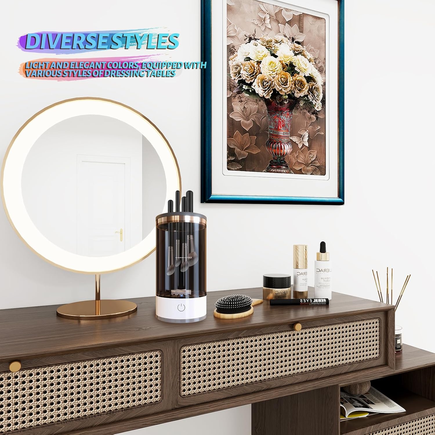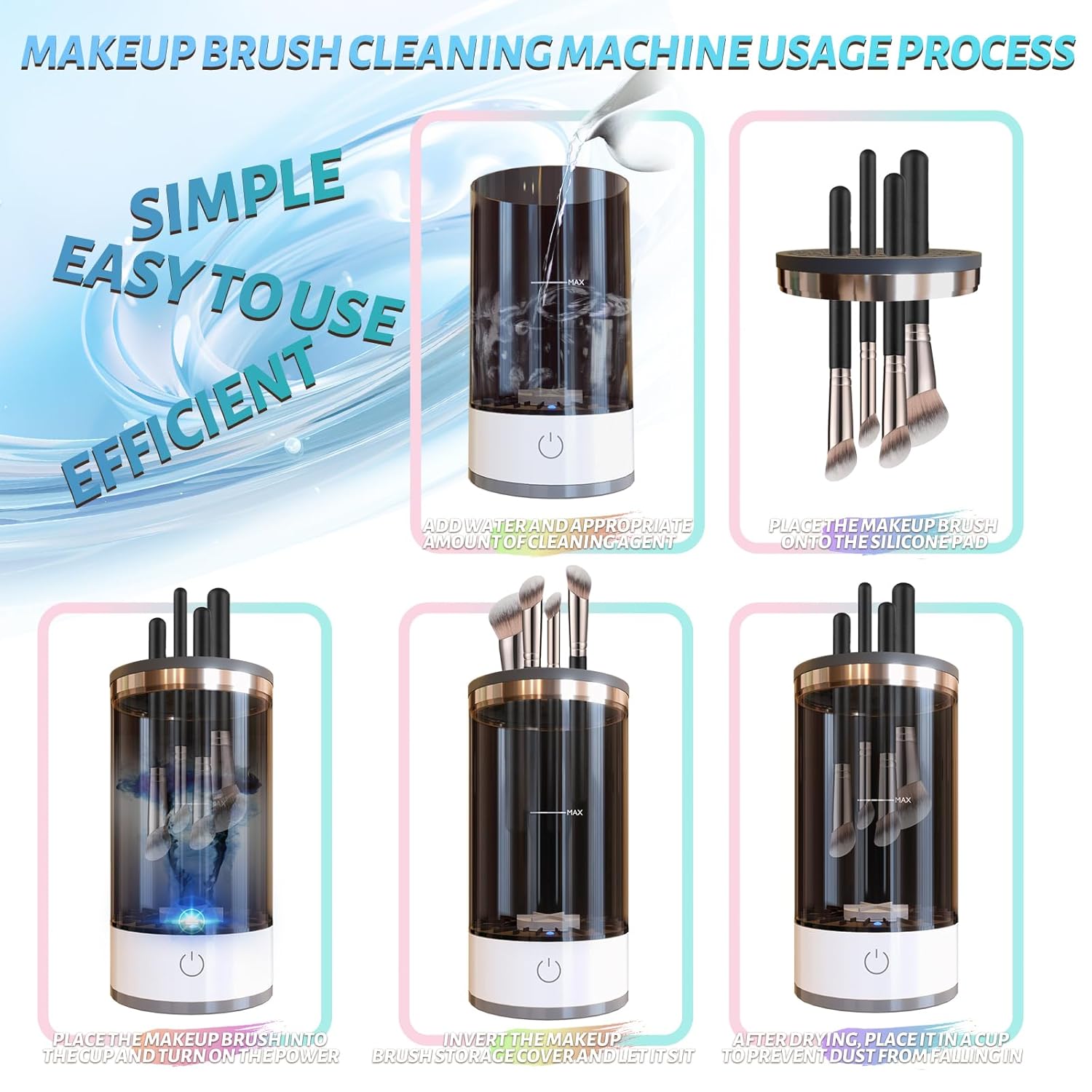 【Both Clean and Store】Supports simultaneous cleaning of multiple makeup brushes, with gentle water wave rotation that does not damage the bristles. After cleaning, insert the brushes upside down into the cover for drying, and then insert them with the brush heads facing down for dust-proof storage