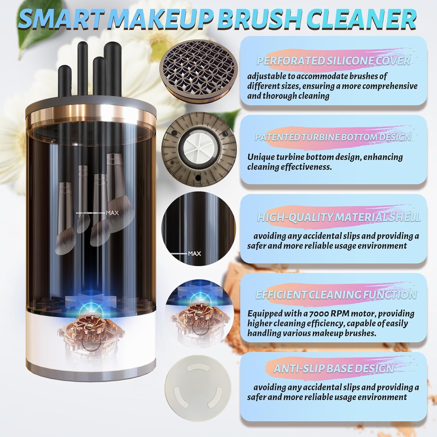 【Perfect for Different Brushes】Upgraded automatic makeup brush cleaner is compatible with a wide range of makeup brushes, regardless of their size or shape. From small eyeshadow brushes to larger powder brushes, it tackles them all with ease. No need to worry about damaging your brushes or using multiple cleaners for different brush types.