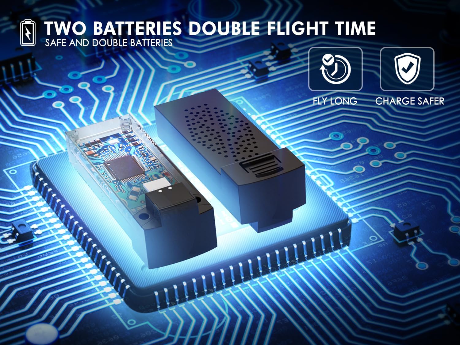 Safe Design & Long Flying Time: Features with low power alarm, emergency stop, and 4 propeller guards to ensure a safe flight of the drone. The extra set of batteries that is included, 2 rechargeable and powerful batteries support up to 18-21 mins, charge safer and fly longer.