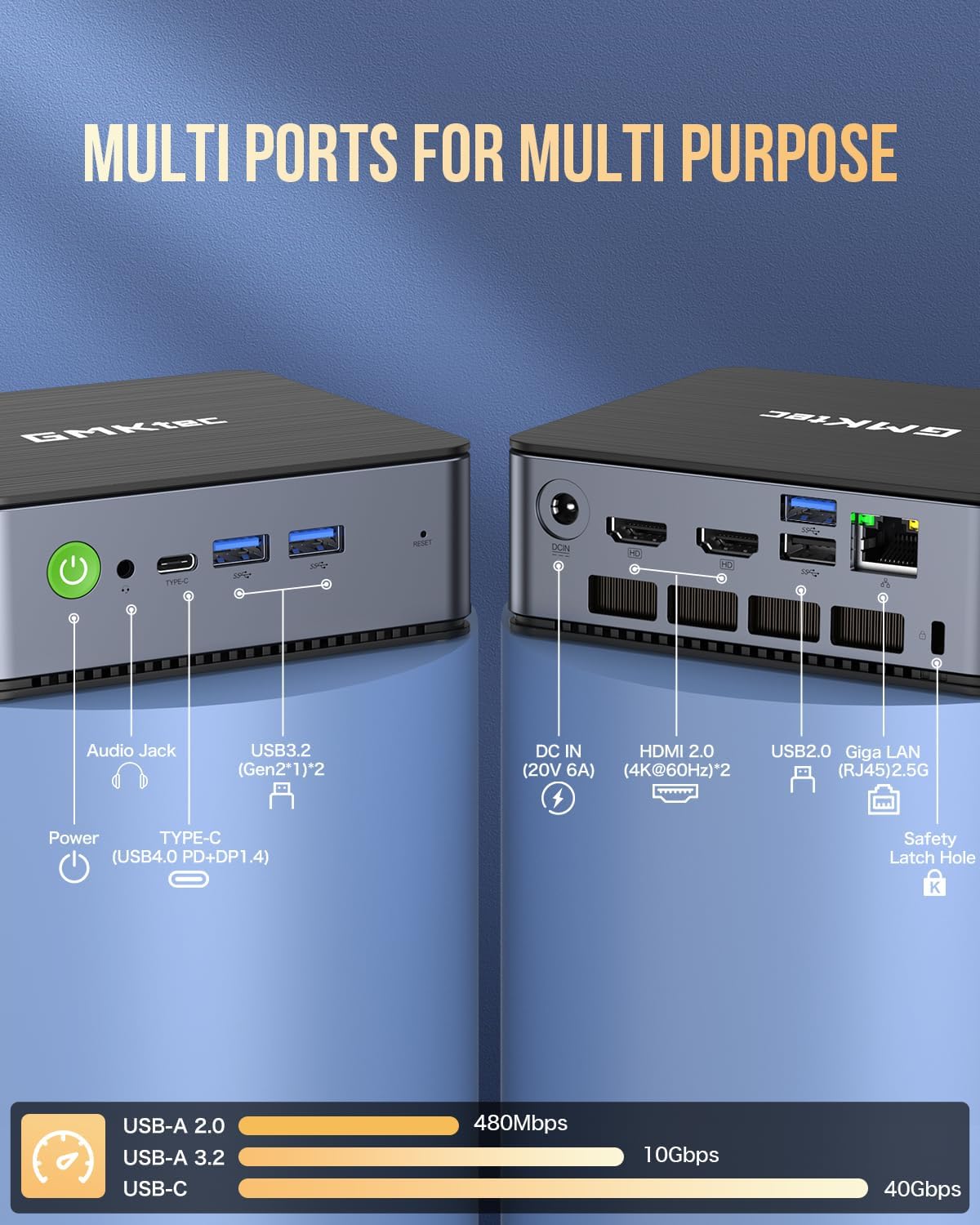 2.5G Ethernet & WiFi6 + BT5.2: GMKtec Mini PC has a 2.5Gbps Ethernet LAN (RJ-45, Network interface speed up to 2.5Gbps bandwidth rate), 2.4Gbps WiFi6(802.11ax, stronger capacity of resisting disturbance), and built-in Bluetooth 5.2, high-speed wireless connection. Interface features 3*USB3.2 ports(10Gbps), 1*USB2.0 ports, 2*HDMI 2.1 port(4K@60Hz), 1*USB-C port(USB4.0 40Gbps), and 1*Audio Jack (HP&MIC), 1*DC Power Port.