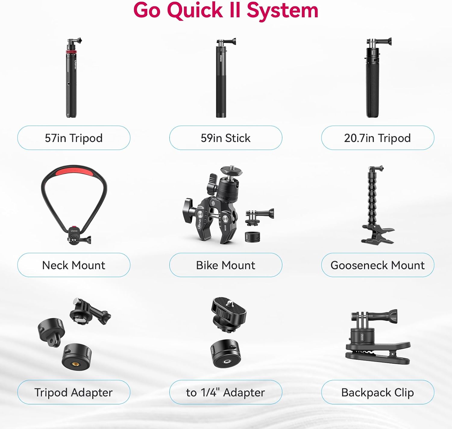 【Quick Release in a Second】the selfie tripod is equipped with Go Quick II System, magnetic mount, strong suction, help you quickly connect in a second without consuming screws. And insert secondary reinforced locking pin, more secure for use.(Only for Action Cameras