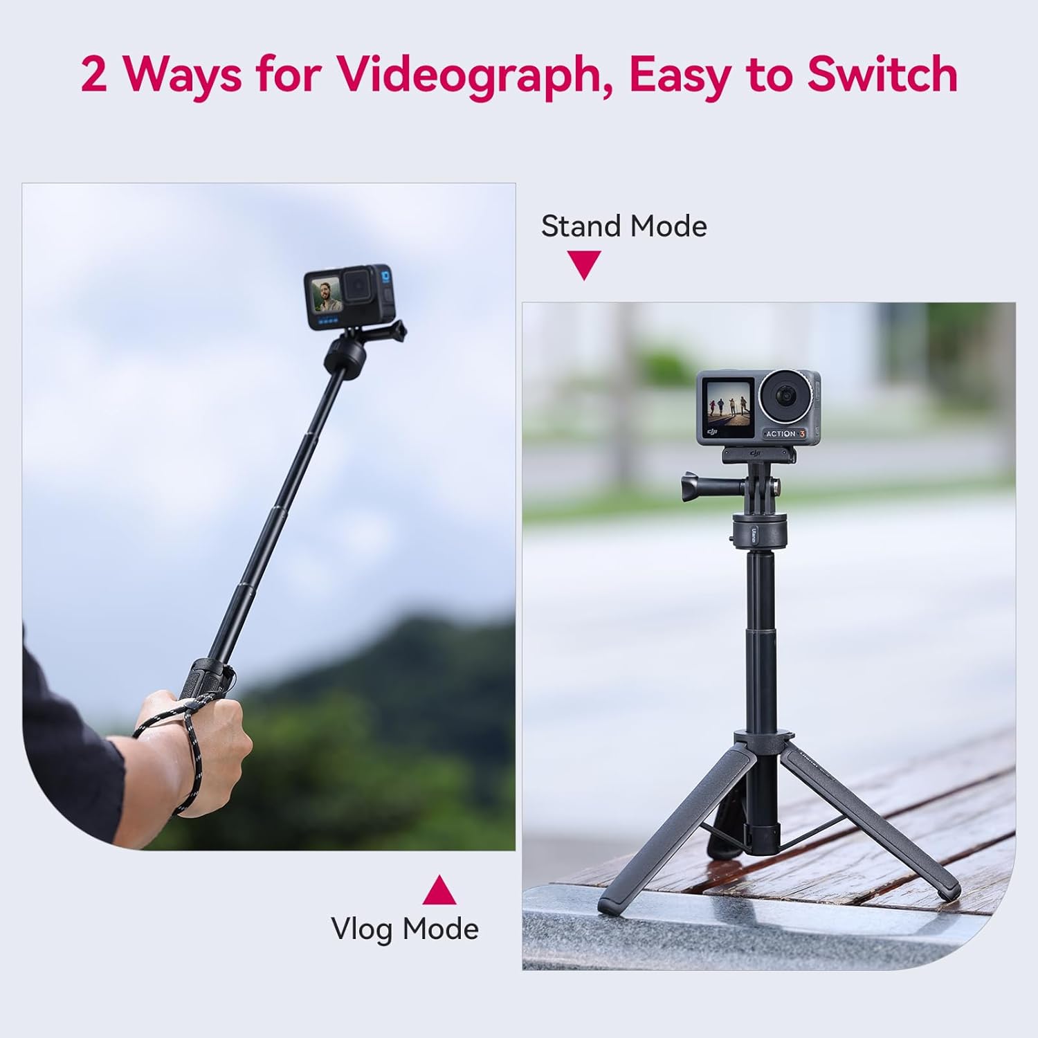 【2 Ways Mode】It’s not only a selfie stick/handle grip, but also works as tripod stand, open the handle, it turns to be 3 tripod legs, gives strong support for tripod mode