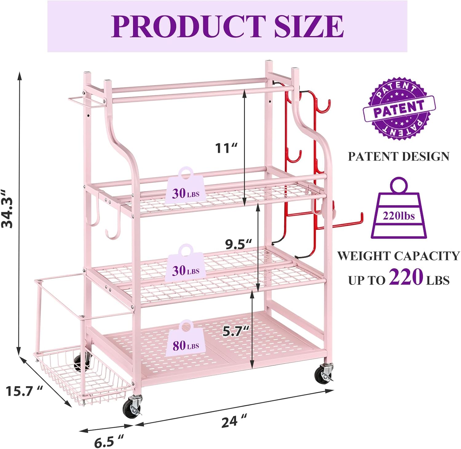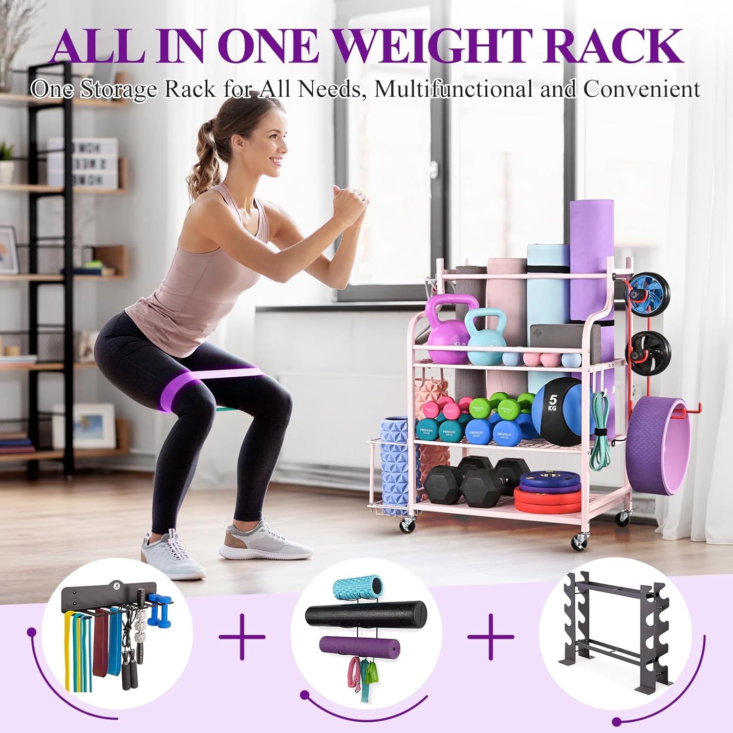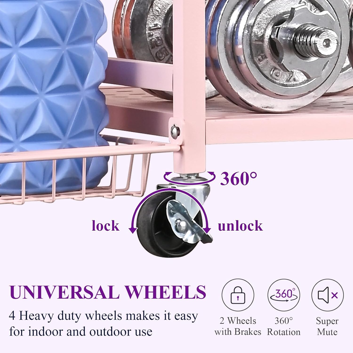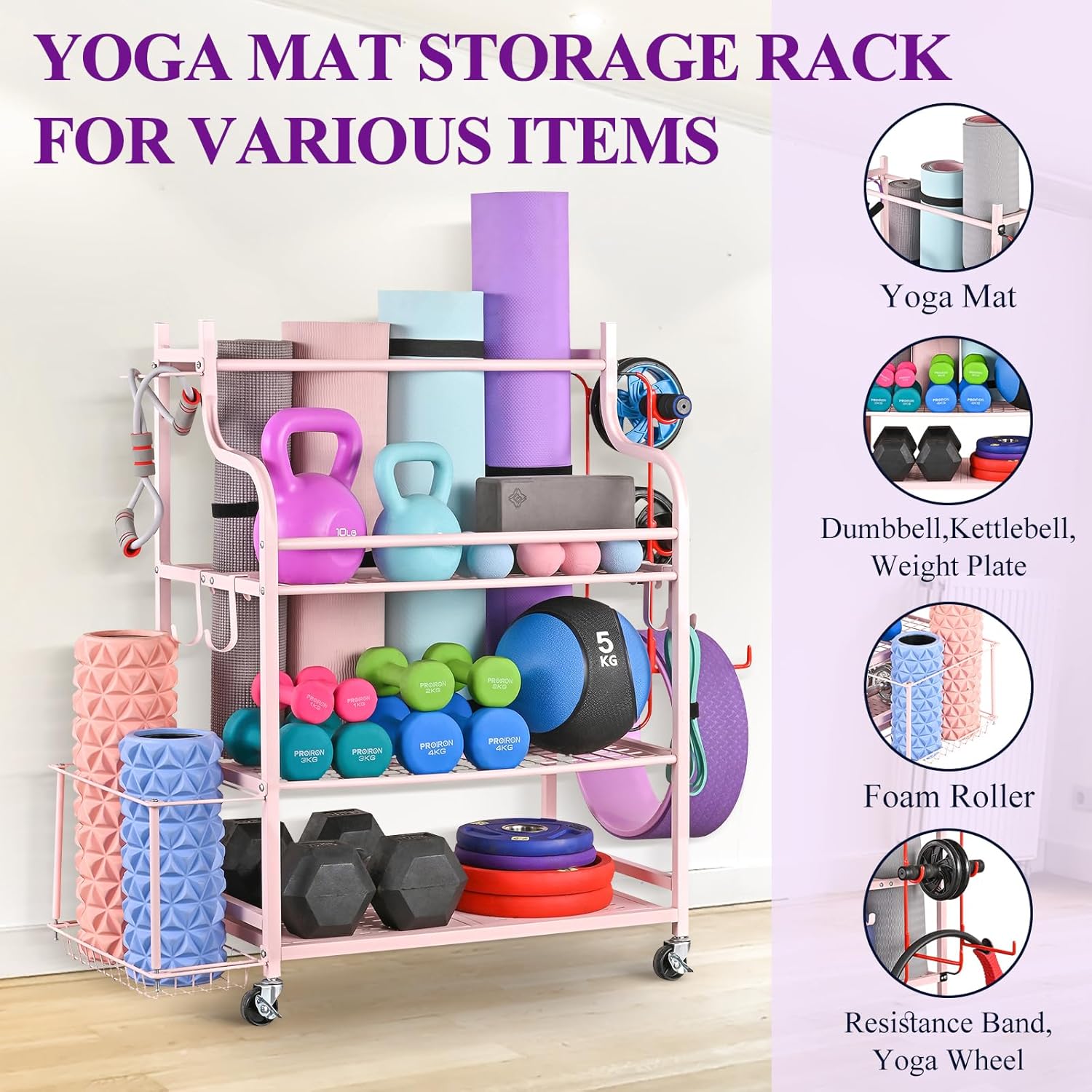 Mythinglogic Yoga Mat Storage Racks,Home Gym Storage Rack for Dumbbells Kettlebells Foam Roller, Yoga Strap and Resistance Bands, Workout Equipment Storage Organizer With Hooks and Wheels