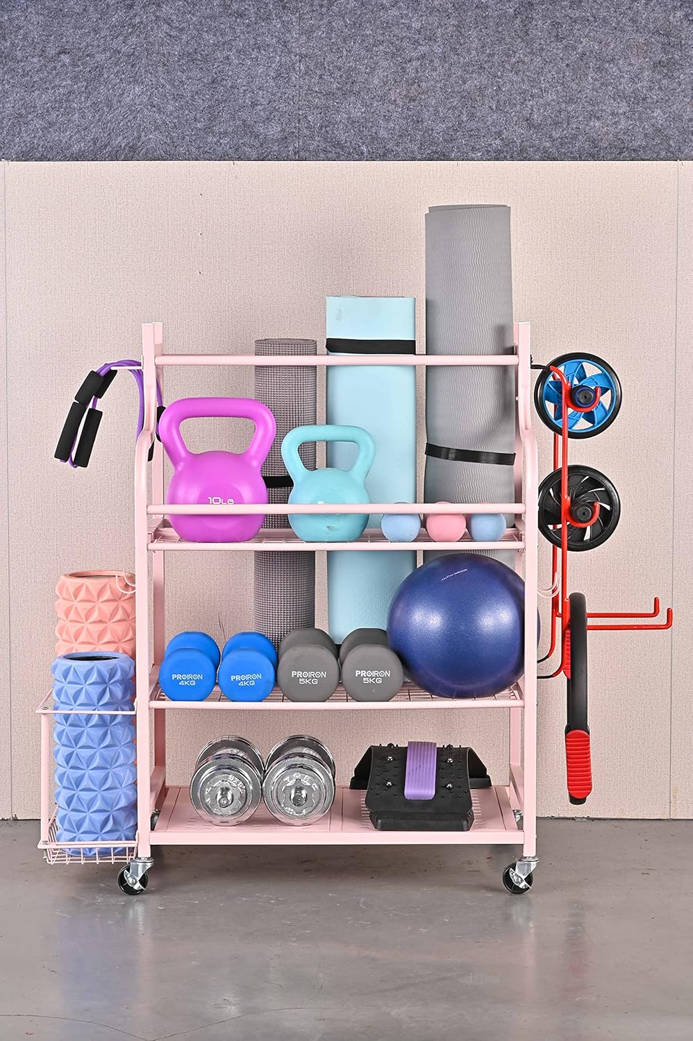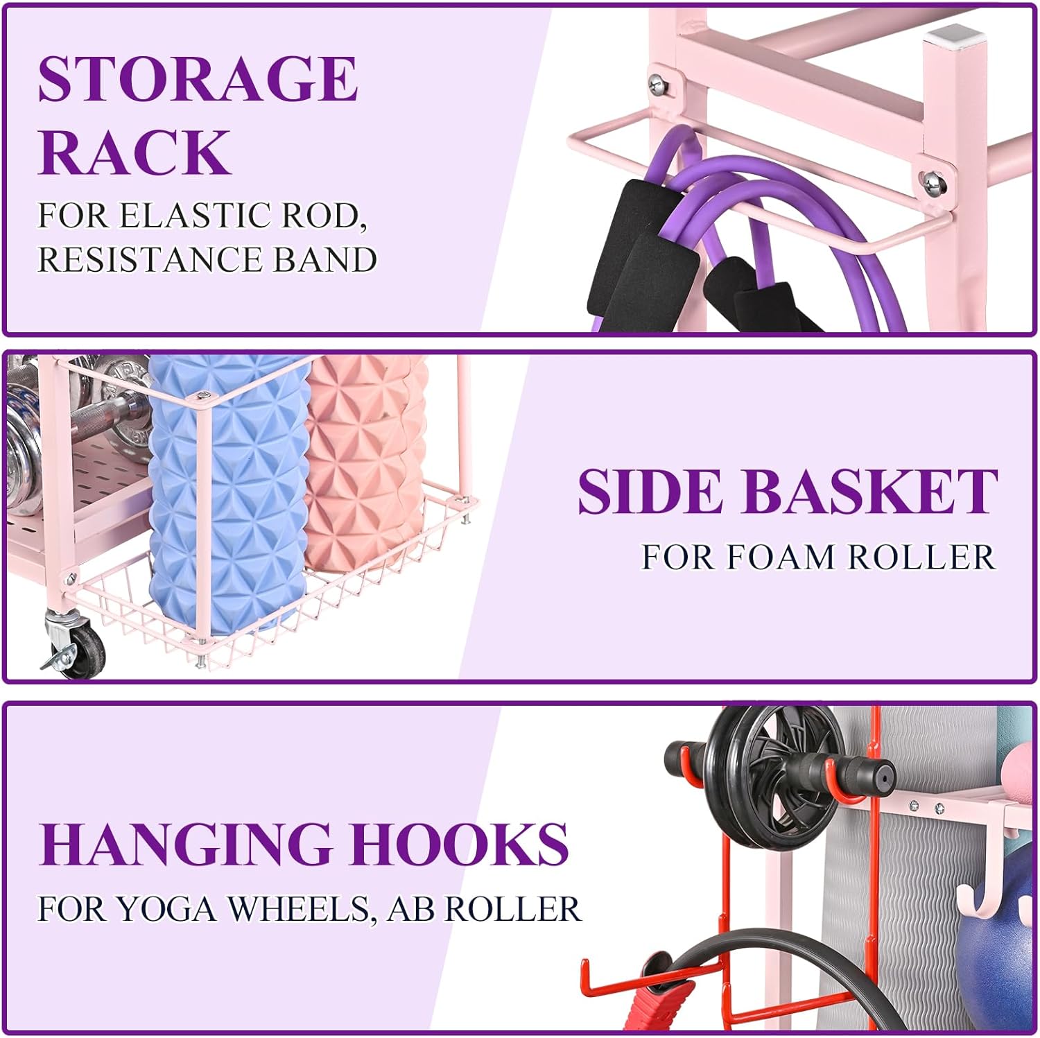 Mythinglogic Yoga Mat Storage Racks,Home Gym Storage Rack for Dumbbells Kettlebells Foam Roller, Yoga Strap and Resistance Bands, Workout Equipment Storage Organizer With Hooks and Wheels