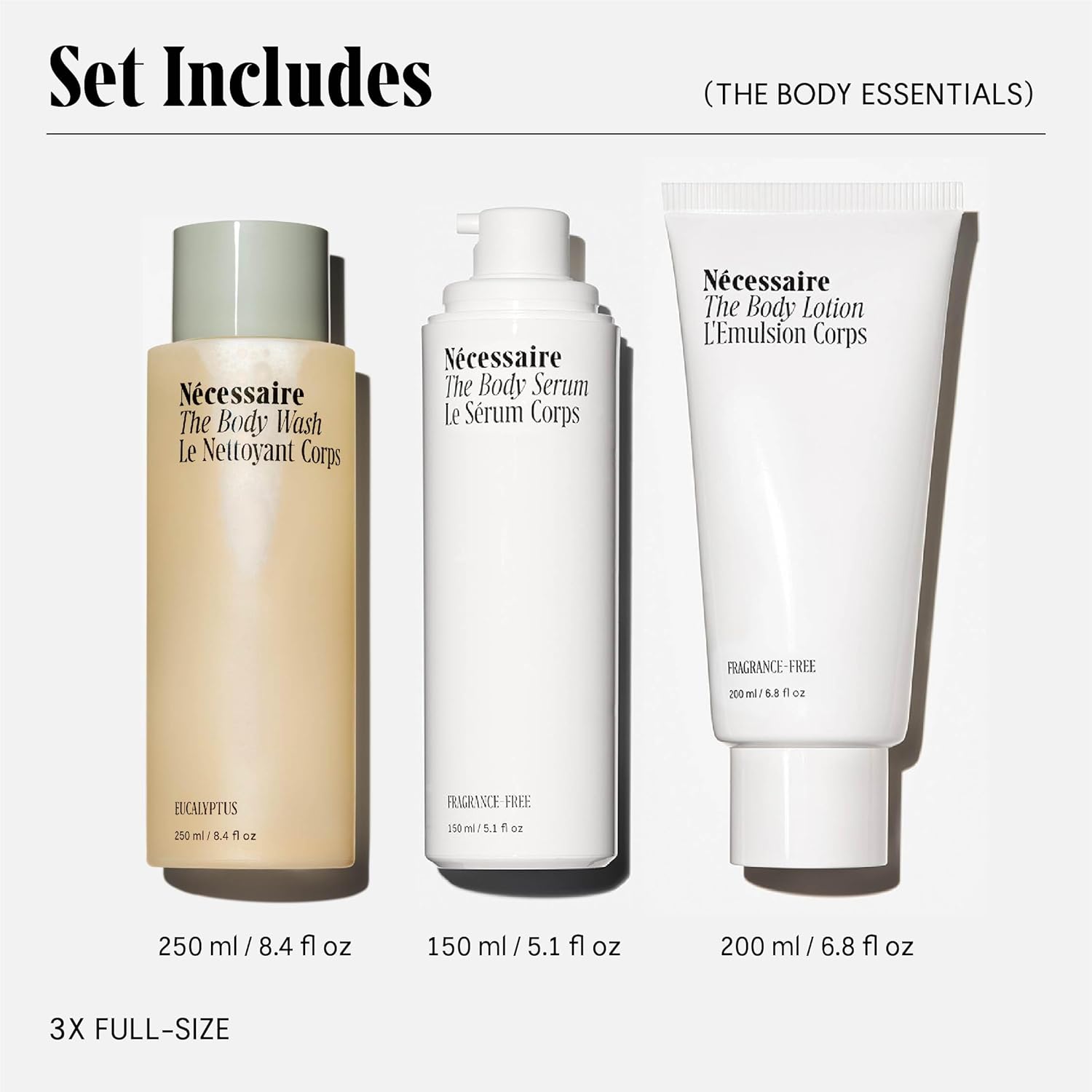 Nécessaire The Body Essentials Gift Set The Body Wash + The Body Lotion + The Body Serum. Replenish, Hydrate, Firm with Vitamins, Omegas, Glycerin, Niacinamide, Hyaluronic Acid, Peptides.