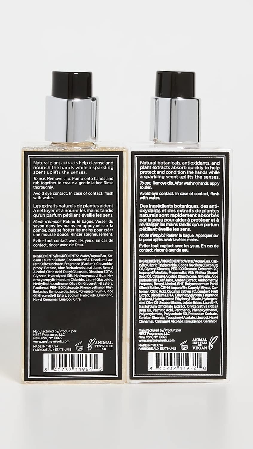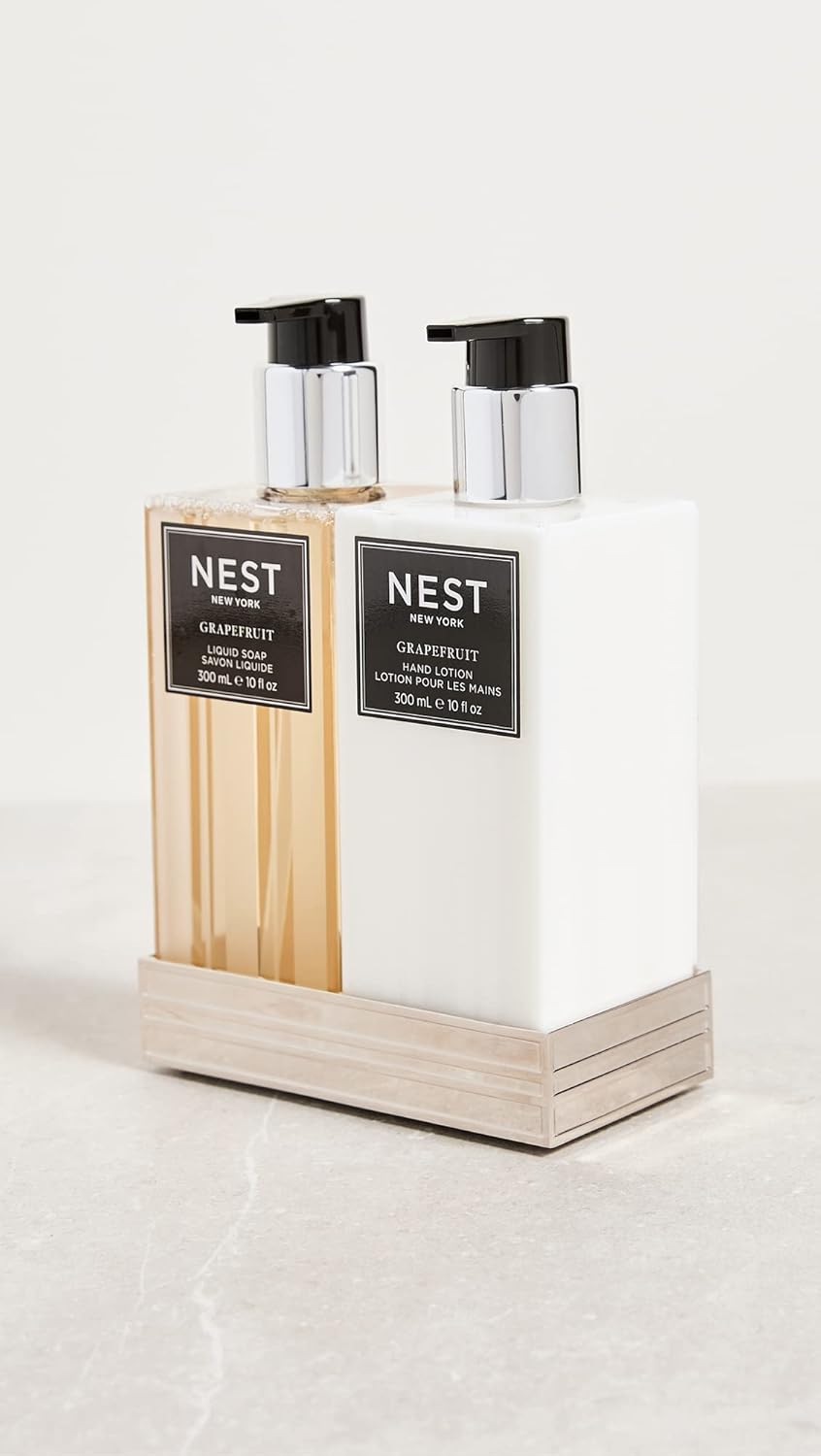 The NEST New York Grapefruit Liquid Soap & Hand Lotion Set adds exquisite fragrance and hydrating skincare to any handwashing station in your home. This paraben-free soap and lotion set includes a 10-fluid ounce bottle of liquid hand soap and a 10-fluid ounce bottle of hand lotion together in a stylish silver tray. Pink pomelo grapefruit combines with watery green notes, lily of the valley, and coriander blossom in this exhilarating, sophisticated fragrance, which instantly uplifts the senses. The refreshing liquid soap contains natural plant extracts to help clean and nourish the skin, while the fast-absorbing hand lotion contains natural botanicals, antioxidants, and plant extracts to help protect and condition skin while leaving hands feeling soft and hydrated. As part of an ongoing commitment to cruelty-free practices, NEST New York has been certified by PETA and Leaping Bunny, two leading organizations that certify brands that operate without animal testing. NEST New York’s fragranced home, perfume, and body care collections transform the everyday by artfully blending notes of the familiar, the exotic, and the unexpected for a fragrance experience like no other. Let NEST New York scent your world.