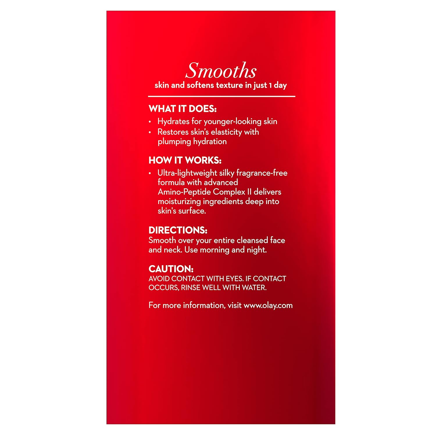 Olay Regenerist Regenerating Serum’s fast penetrating fragrance-free formula is a silky, ultra-lightweight gel serum that regenerates surface cells while restoring skin’s elasticity with plumping hydration. Infused with Olay’s Amino-Peptide Complex II, this formula is designed to deliver moisturizing ingredients 10 layers deep into the skin surface. After just 4 weeks, skin’s appearance is firmer. The appearance of fine lines and wrinkles are also improved. Non-greasy and fast-absorbing, it’s the perfect addition to your everyday beauty routine for hydration to achieve firmer, younger-looking skin. Ingredients: Ingredients: Cyclopentasiloxane, Water, Glycerin, Polymethylsilesquioxane, Niacinamide, Dimethicone, Dimethicone Crosspolymer, Panthenol, Butylene Glycol, Propylene Glycol, Palmtoyl Pentapeptide 3, Carnosine, Tocopheryl Acetate, Camellia Sinesis Leaf Extract, Allantoin, Cetyl Ricinoleate, Bis Peg/Ppg 14 Dimethicone, Peg 10 Dimethicone, Peg 100 Stearate, Peg 10 Dimethicone Crosspolymer, Disodium Edta, Ethylparaben, Propylparaben, Methylparaben, Benzyl Alcohol, Citric Acid Vitamin B3, Pro Vitamin B5, Amino Peptide, Vitamin E, Green Tea