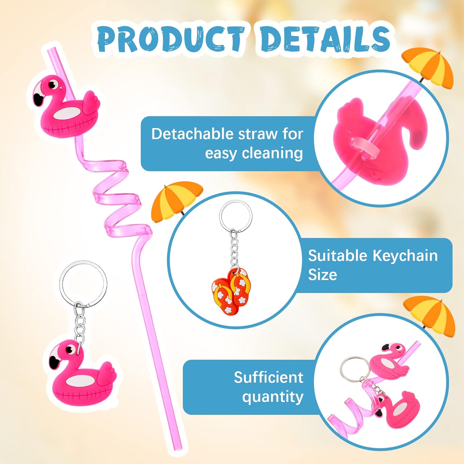 Distinctive Design: the decorative plastic straws and keychains adopt popular Hawaiian elements, and bright colors, including watermelon, flamingo, beach ball, ice cream and other shapes, eye catching and adorable