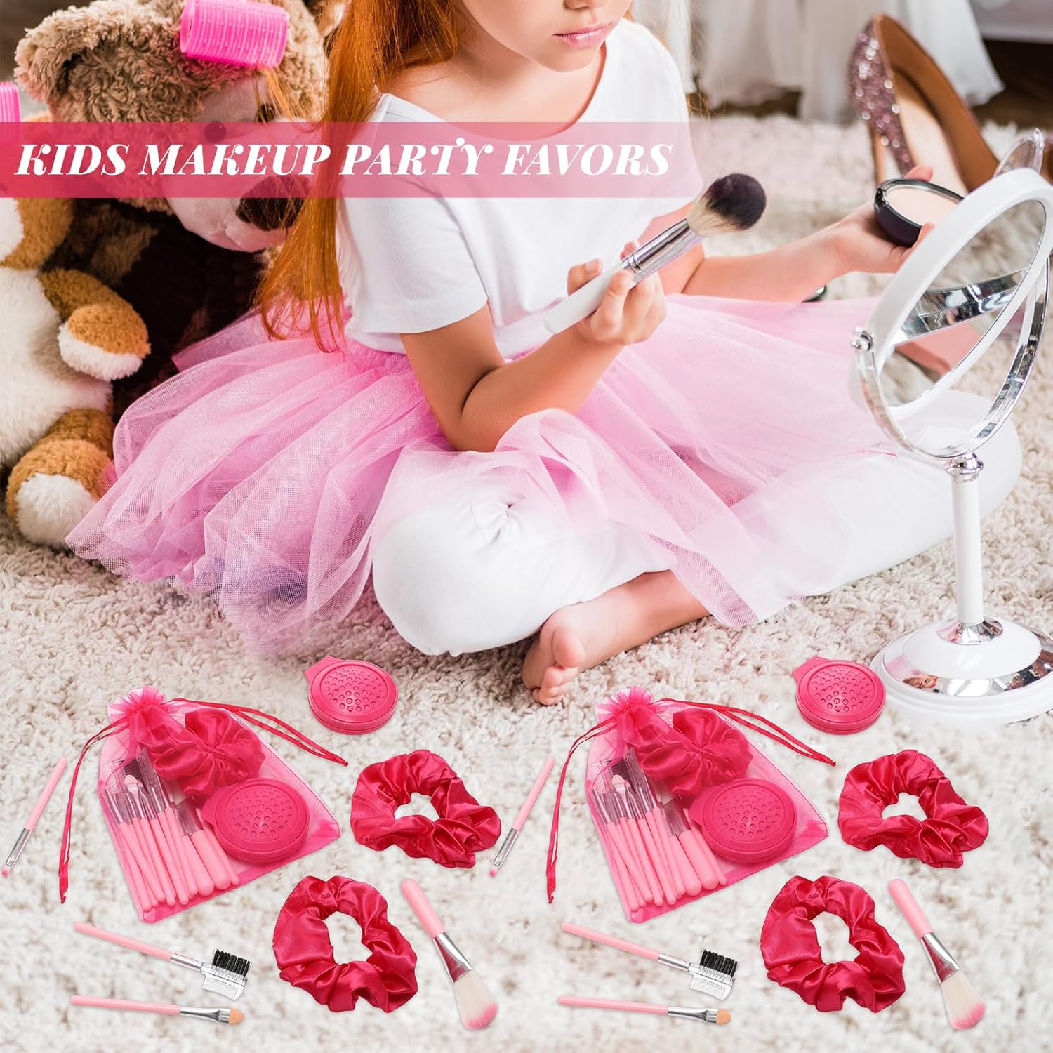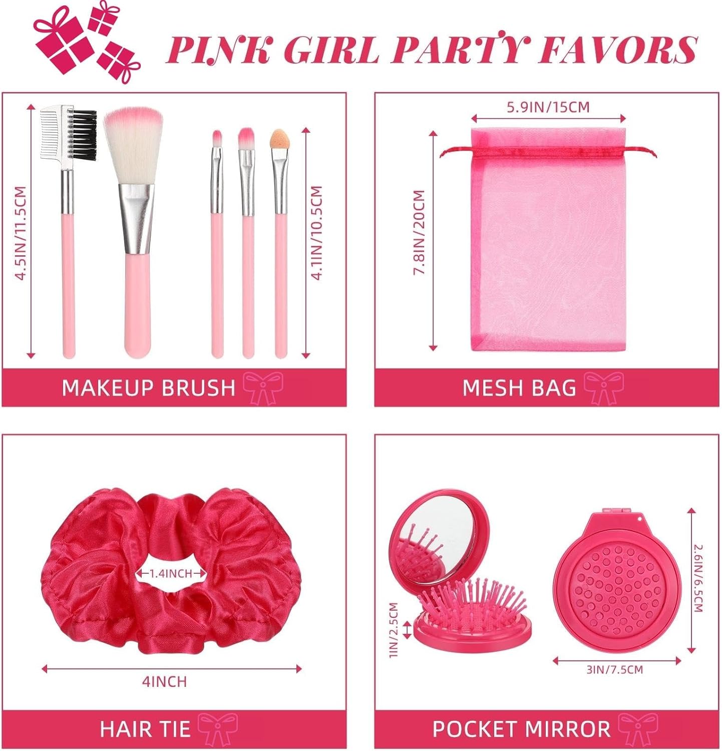 Tailored for Girls: the pink girl party favors are designed meticulously to cater to the need of the little princess’s party; These 48 girl makeup party favor kits come with 12 foldable mirror hair brushes, 12 pink hair scrunchies, 12 sets of makeup brushes, and 12 pink organza bags; Fit for many pink princess or girl themed parties, this comprehensive solution combines multi functionality and cosmetics for girls