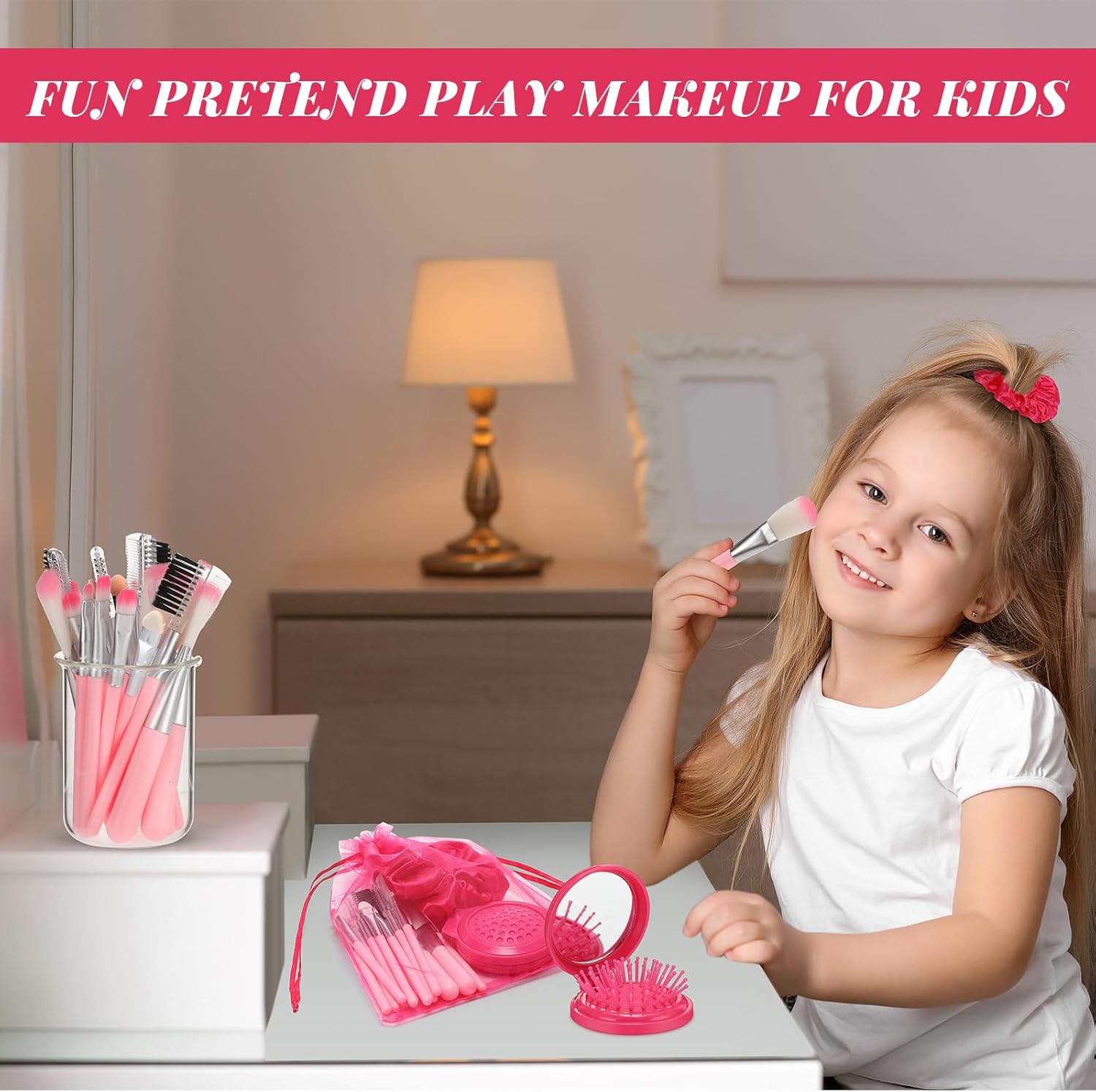 Child Friendly Size: the makeup kit for girl toys is aptly sized; The 3 inch cute pink mirror hair brushes fit children’s hands and are compact enough for easy portability; The 4 inch hair scrunchies reduce the chances of hair slipping or pulling; The makeup brushes are 4.6 inches in size; The pink organza bags, sized 5.9 x 7.9 inches, are ideal for neat storage and carry