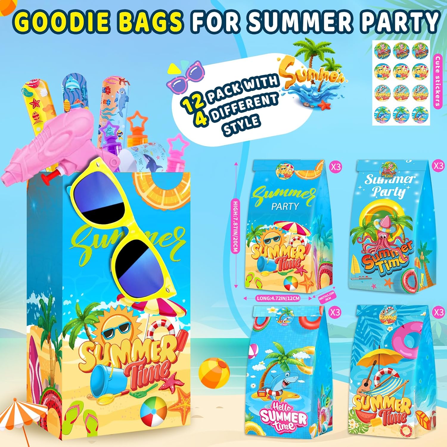 【Super Valued Package of Pool Party Favors】- The package includes 132pcs of pool party supplies, providing everything you need for hours of fun at outdoor beach play and swimming pool parties. It includes 12 kids sunglasses party favors, 12 inflatable beach balls, 12 mini water squirts, 12 slap bracelets, 12 bubble wands, 12 paper treat bags with bag round stickers, and 60 summer ocean theme stickers. This package is a great choice for kids aged 4-8 8-12!