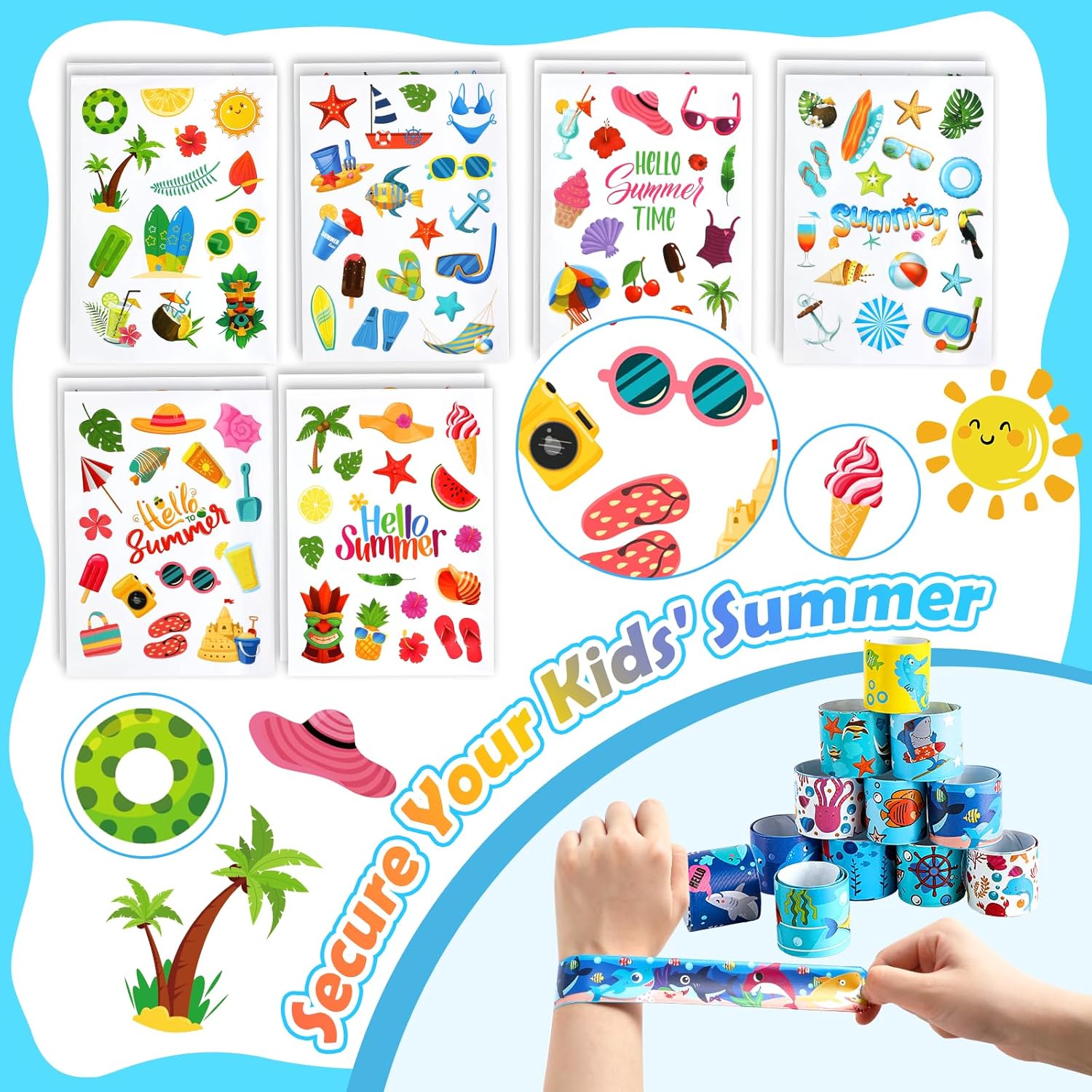 Including a variety of vibrant and colorful stickers for kids like watermelon, coconut, sunglasses, beach balls, and more.