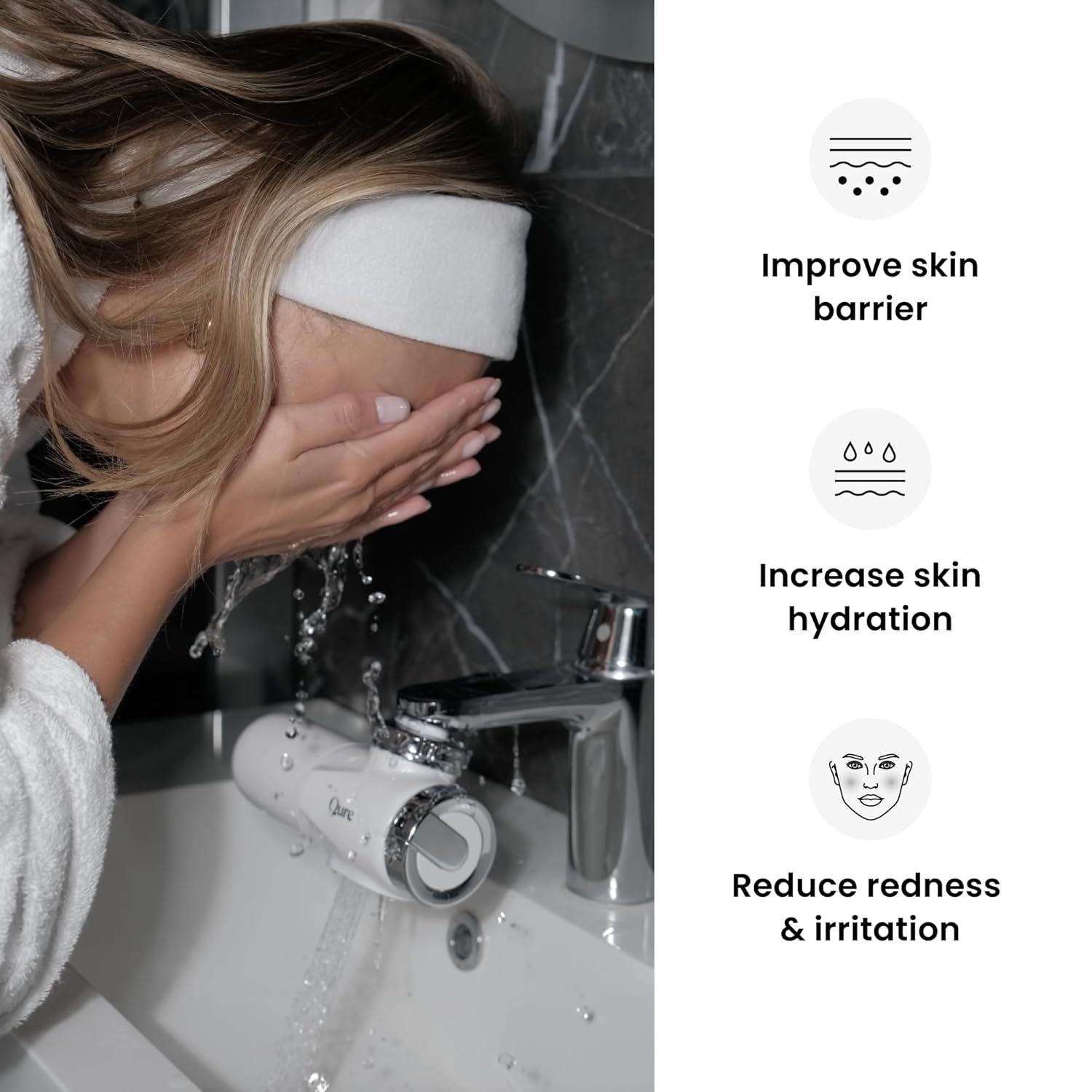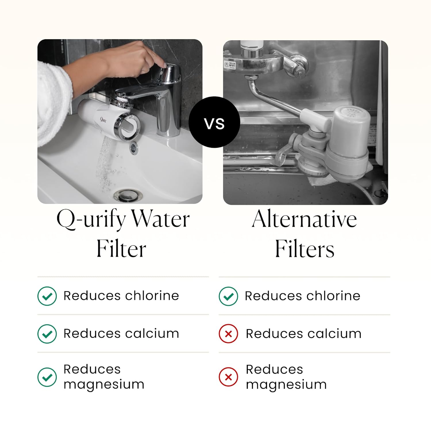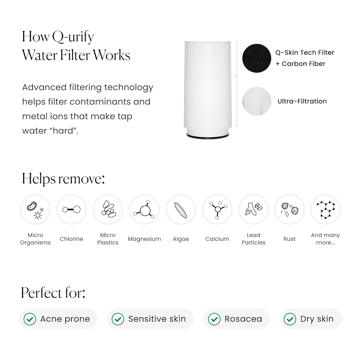 Introducing the Q-urify Water Filter! Unleash the Power of Comprehensive Filtration: Say goodbye to ordinary filters that merely scratch the surface. The Q-urify Water Filter stands as a beacon of innovation, going beyond standard chlorine removal. While others focus on just one aspect, our advanced filtration system tackles the skin-barrier disruptors, calcium, and magnesium, setting a new standard for water purity. Scientifically Proven, Dermatologist Approved: Backed by rigorous scientific research and the stamp of approval from dermatologists, the Q-urify Water Filter is not just a filter; it’s a skincare essential. We understand that true beauty begins with healthy skin, and our groundbreaking technology ensures that your water is free from the culprits responsible for skin barrier impairment. Turn Your Faucet into a Fountain of Youth: It’s time to shift your focus from scrutinizing ingredient lists to cherishing the water that flows from your faucet. Research has unequivocally shown that water hardness plays a pivotal role in skin issues like atopic eczema and dermatitis. The Q-urify Water Filter is your key to transforming your daily routine into a skin-loving ritual. Elevate your skincare journey with the Q-urify Water Filter – because radiant skin starts with the purity of water.