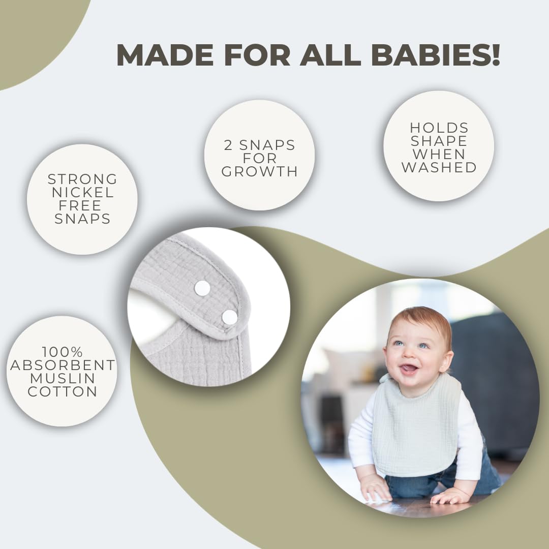 Size 8 inches x 11 inches Bib Material 100% Muslin Cotton Bibs Snap Material Nickel Free Plastic (WARNING: small parts. All children should be accompanied by an adult while wearing baby bibs) Colors Gender Neutral – aesthetically pleasing Child Size Recommended for infant (0+ months) or toddlers up to 24 months (depending on size of child) Tag/Brand Location We placed our logo on the back of the bibs so it doesn’t hinder your photo opportunities Quantity 6 per package