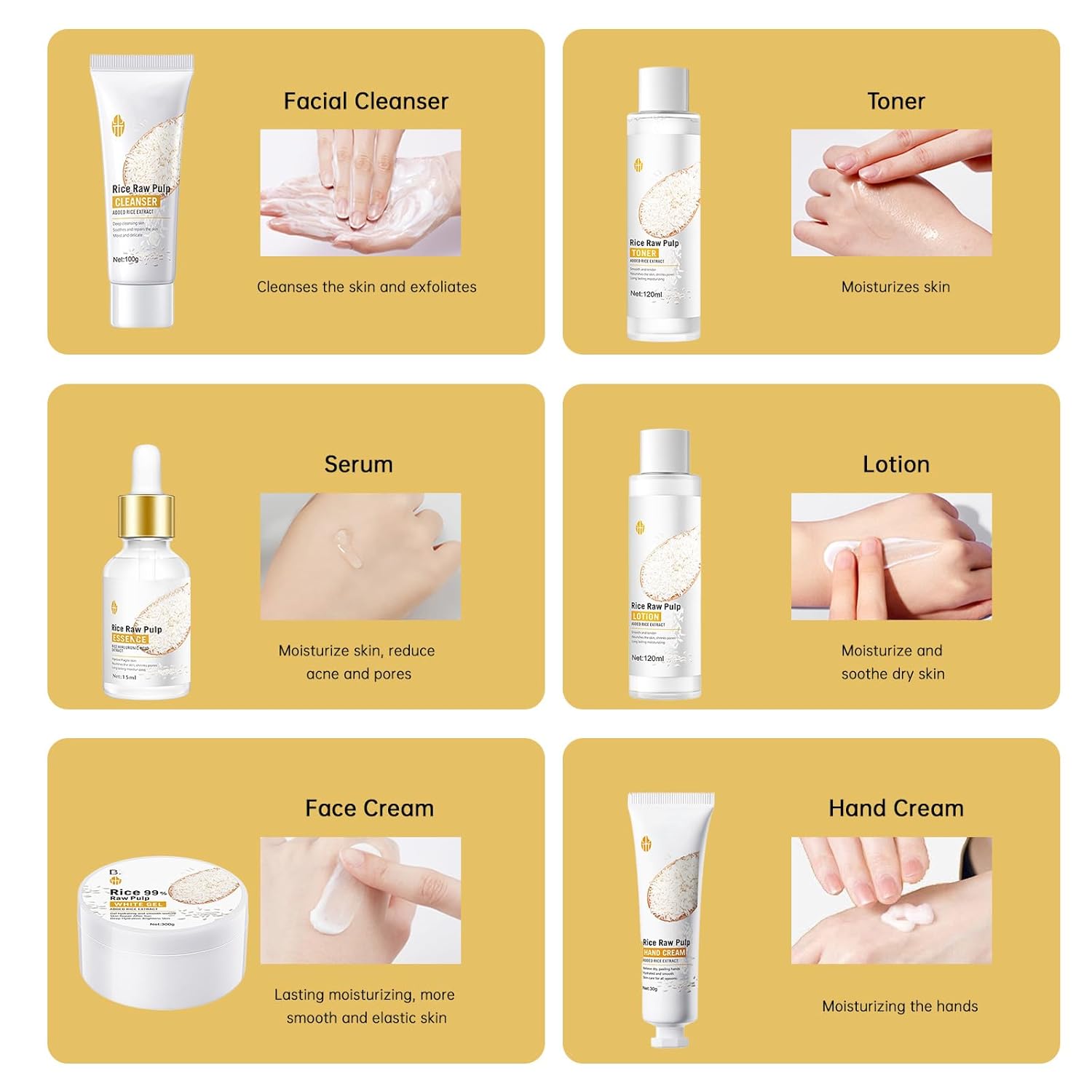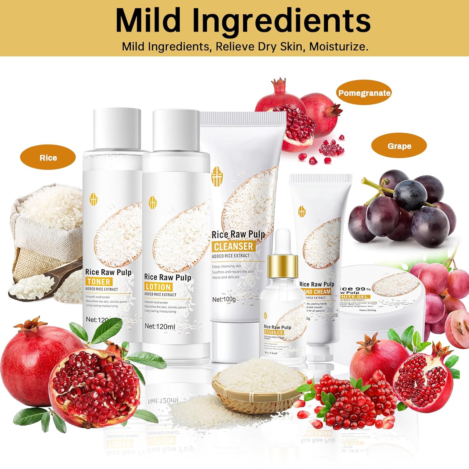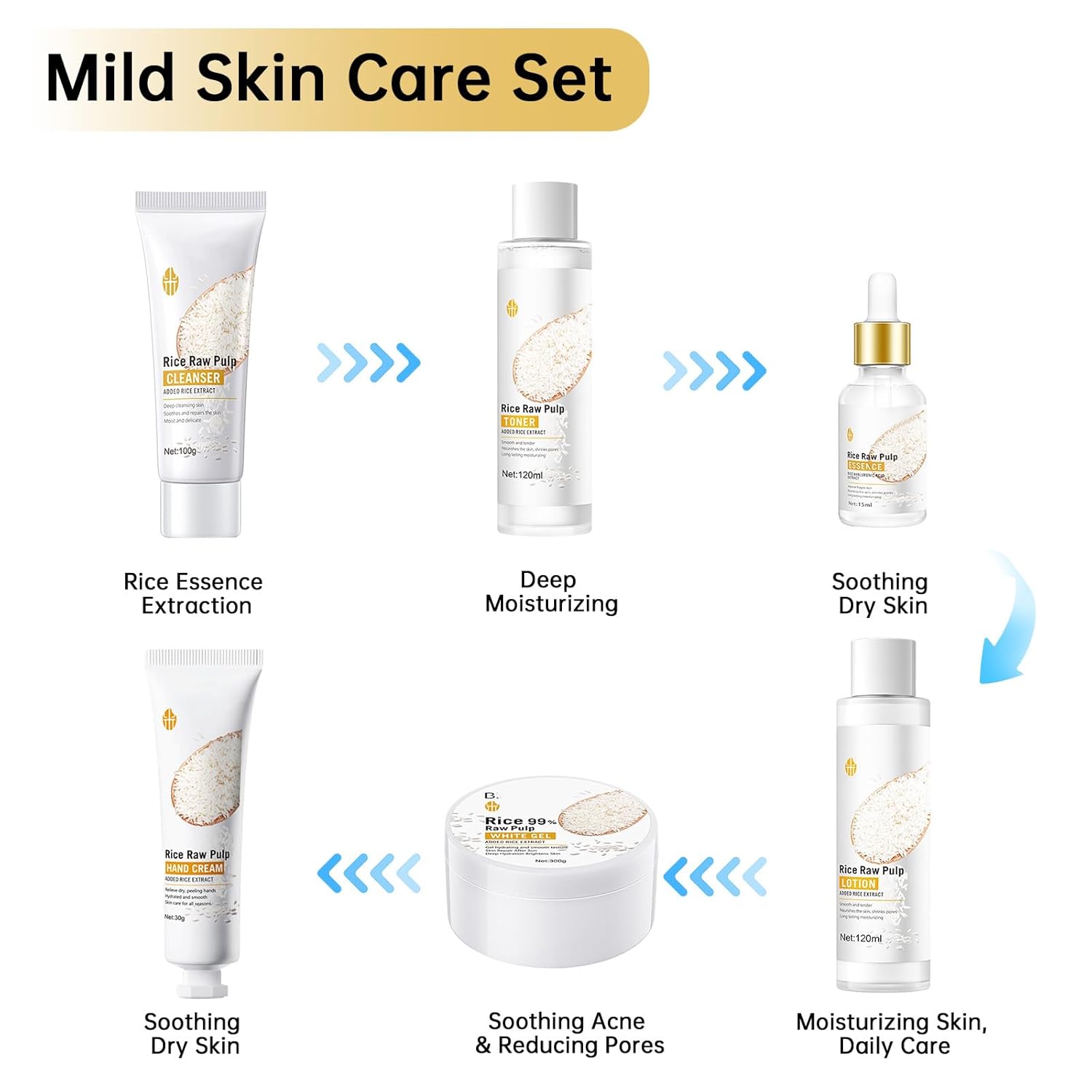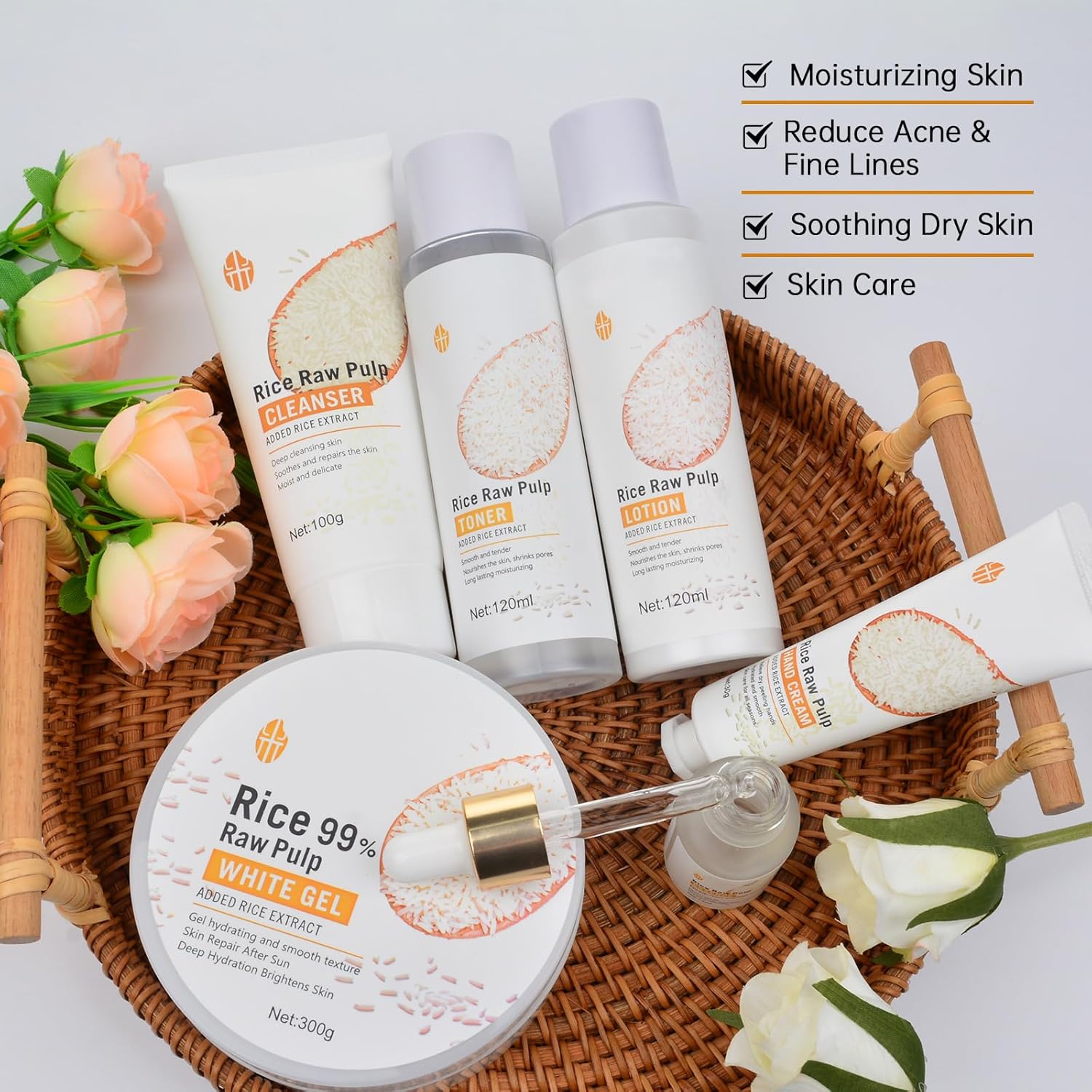 Rice Skin Care Set For Women, 6PCS Gentle Moisturizing Face Care Set With Face Wash, Toner, Emulsion, Serum, Gel, Eye Cream, Natural Skincare Set With Rice Essence For Teen Girls.