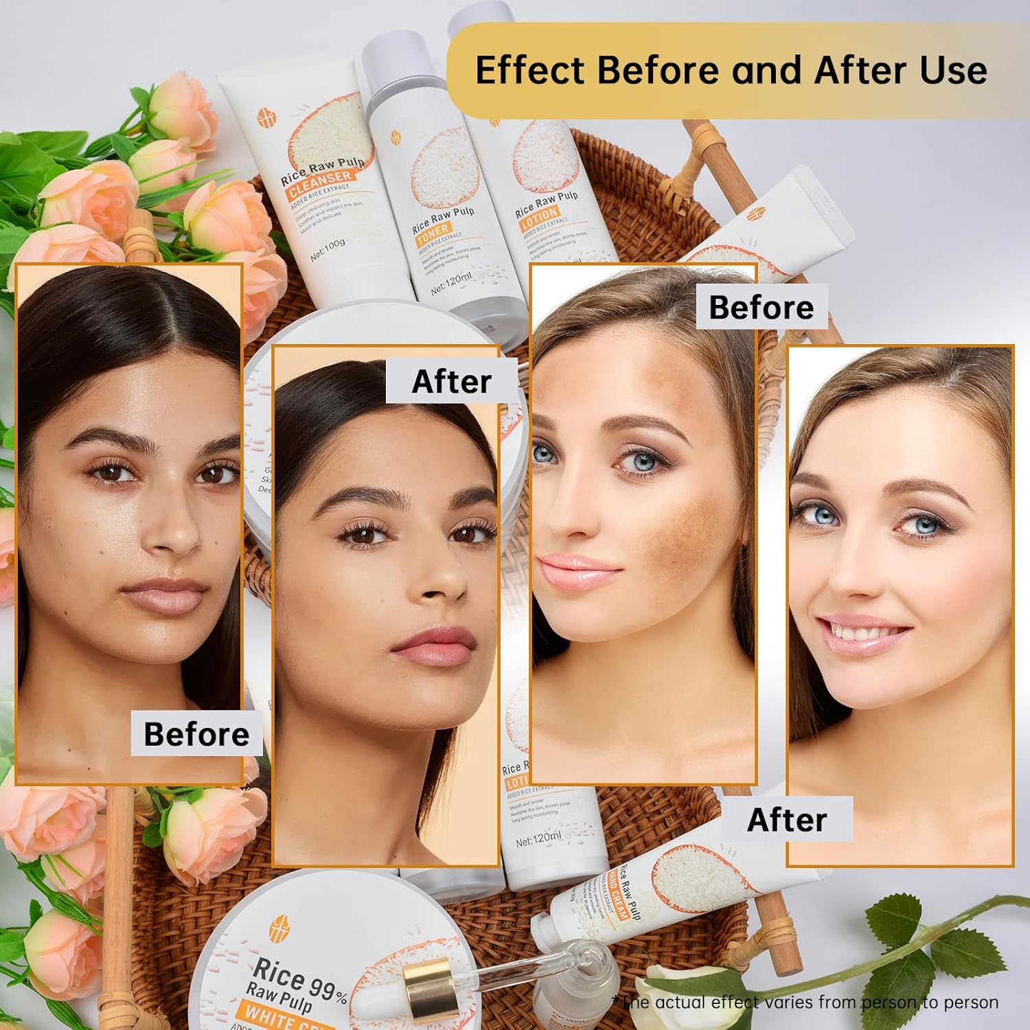 🍃Rice Skin Care Set —- 6 PCS Skin care set containing rice paste essence includes: toner, emulsion, facial cleanser, essence, gel and eye cream. Effectively moisturizing and smoothing the skin.