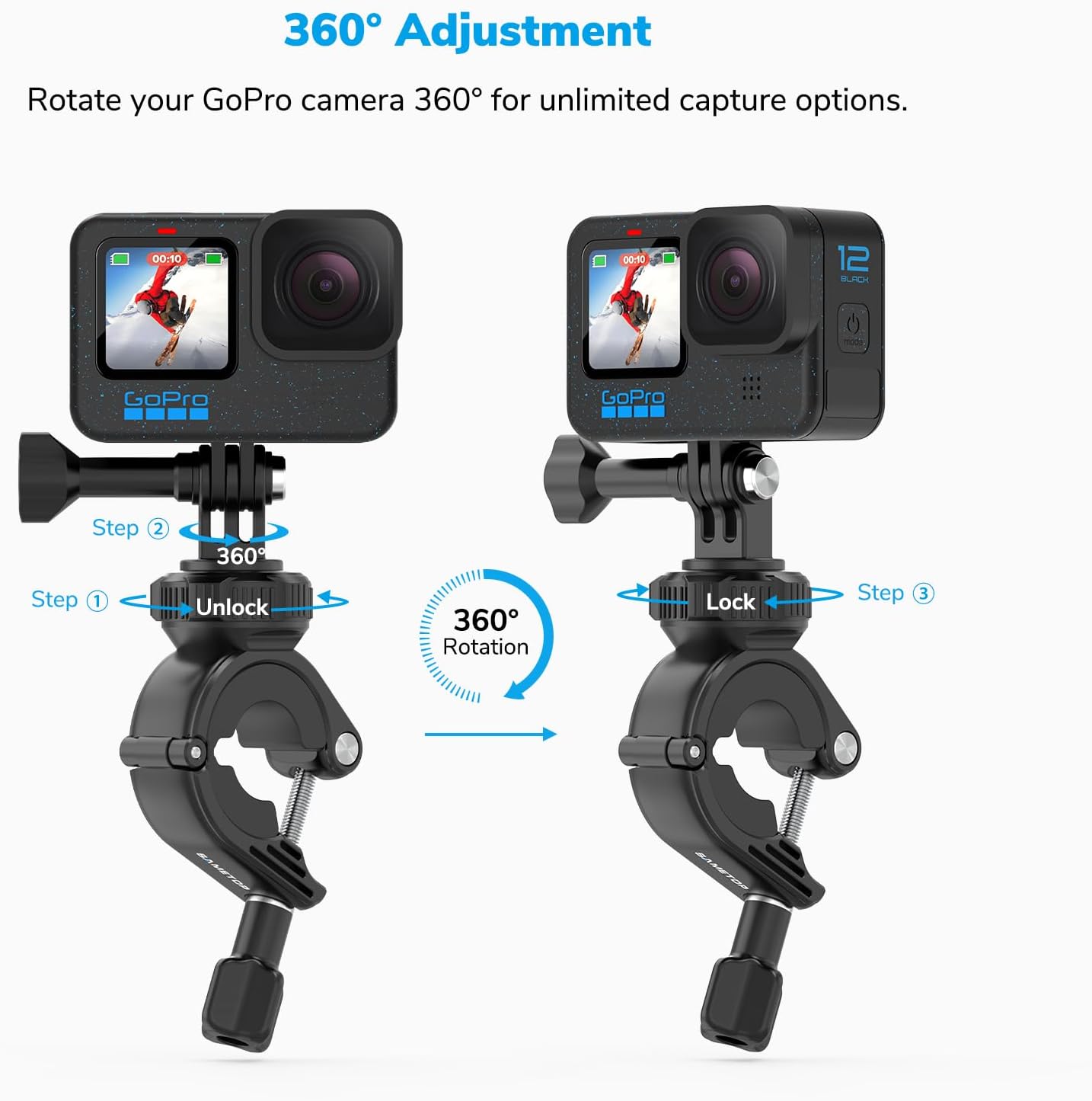 【360° Adjustment】The bar mount features 360° rotation, ensuring the perfect angle for every shot and allowing rapid changes in perspective for more dynamic footage.