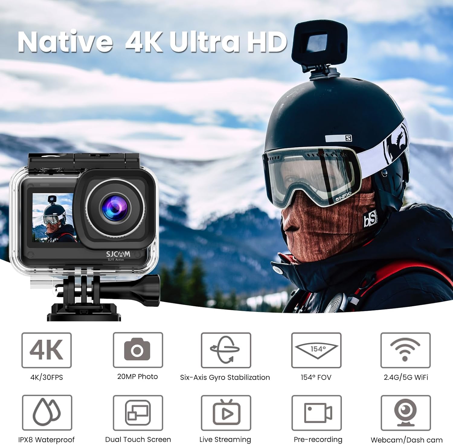 SJCAM SJ11 Active HDR Upgraded 4K30FPS WiFi Action Cameras Touch Screen Stabilization 3.0 Remote Control Adjustable FOV 8X Zoom IPX8 Waterproof Underwater Camera with Helmet Bicycle Kits 3Hr Battery