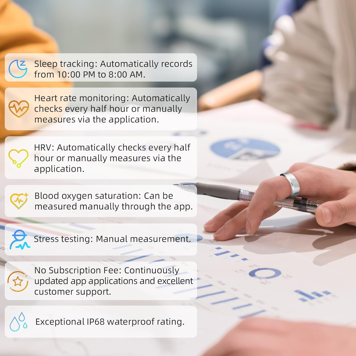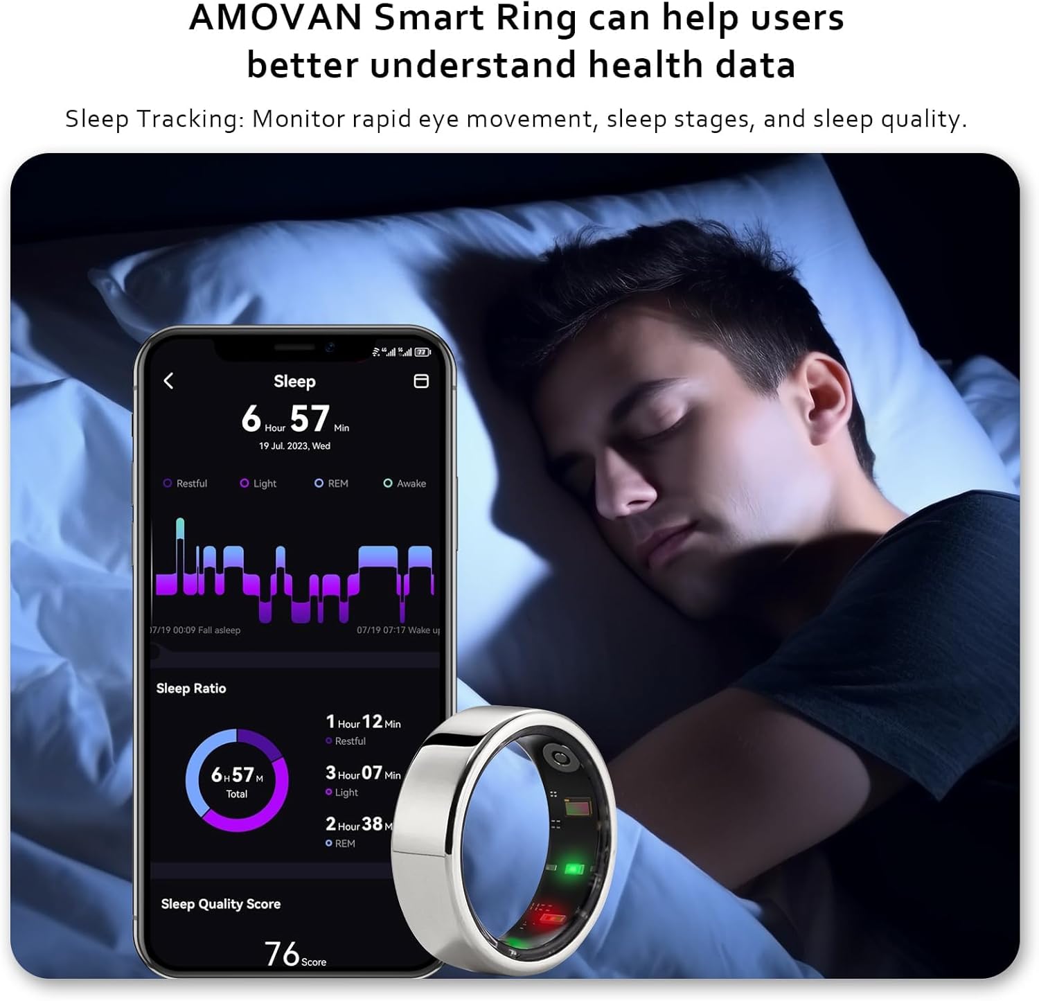Q:How to Choose the Right Ring Size?A:We recommend buying a smart ring sizing kit ASIN:B0CLHW28BG to get your exact size. Or you can follow the instructions in the diagram to measure your finger (may have slight deviations).Q:Do I need to pay a subscription fee to access ring data?A:The AMOVAN Ring application does not require a subscription fee. If you encounter any issues during use, you can provide feedback through the application’s help center.Q:Which finger should I wear the ring on?A:We recommend either your index, middle, or ring finger for the Smart Ring.