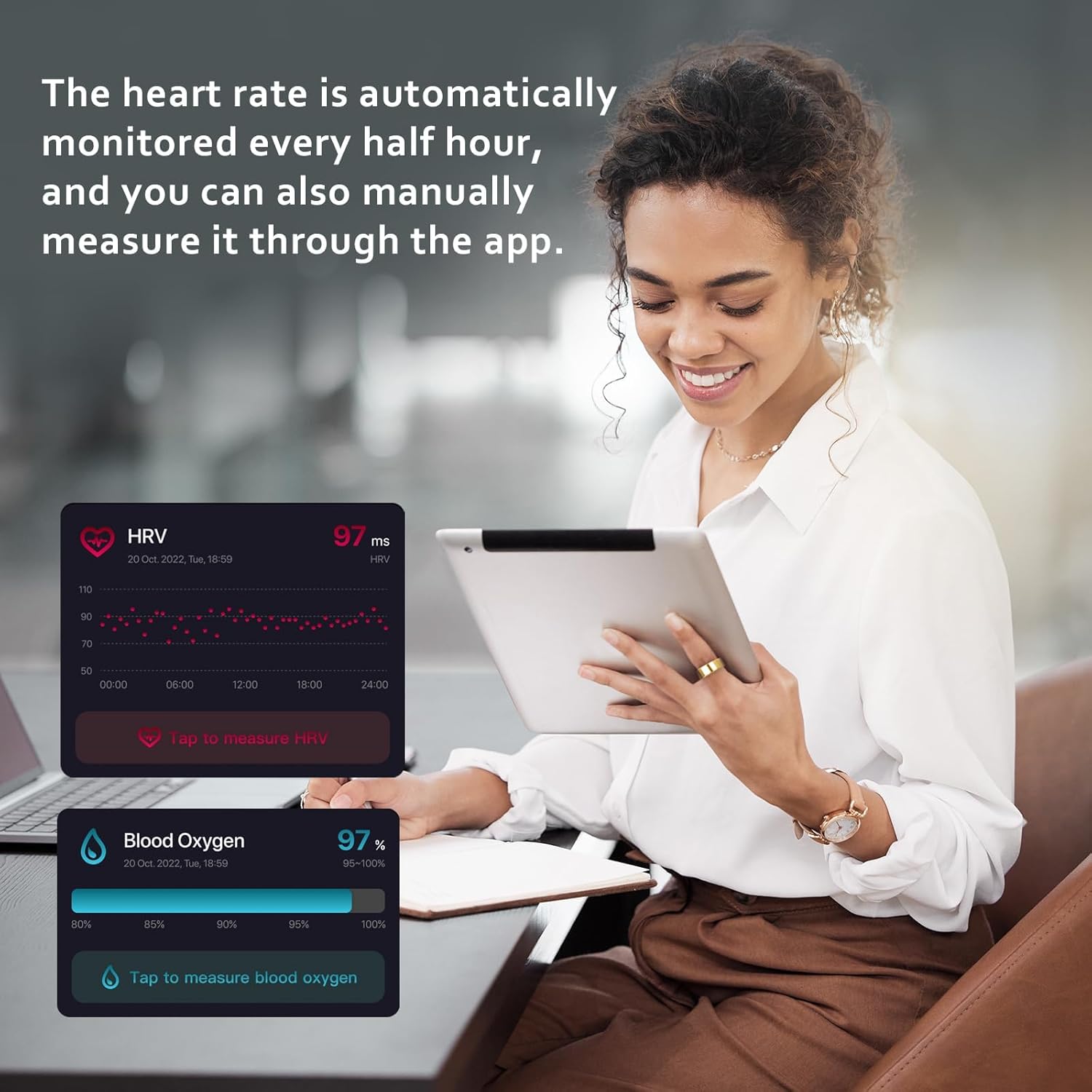 💍Activity Fitness Tracker: The fitness tracking ring records exercise data and automatically monitors your heart rate and HRV every half hour, or you can do it manually via the app. Blood oxygen saturation and stress tests are measured manually via the app.