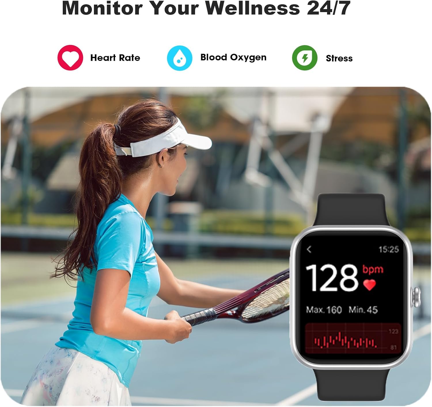 【Monitor Your Wellness 24/7】 Our smart watch automatically tracks your real-time heart rate and sleep patterns (deep sleep, light sleep, and awake times), providing automatic analysis of your sleep quality. It also offers blood oxygen saturation measurement and stress level tracking, keeping a close eye on your overall physical well-being.