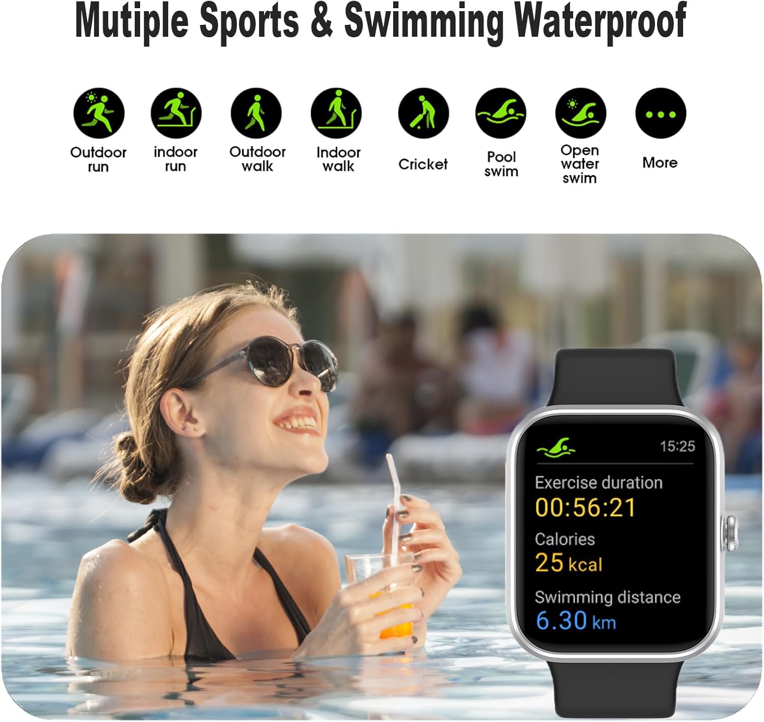 【Swimming Waterproof Watch】 Waterproof up to 50 meter, allowing worry-free use during swimming and water activities. More additional functions include stopwatch, pedometer, breathing exercises, music control, photo control, weather forecast, women’s health reminder, mobile phone search, etc.