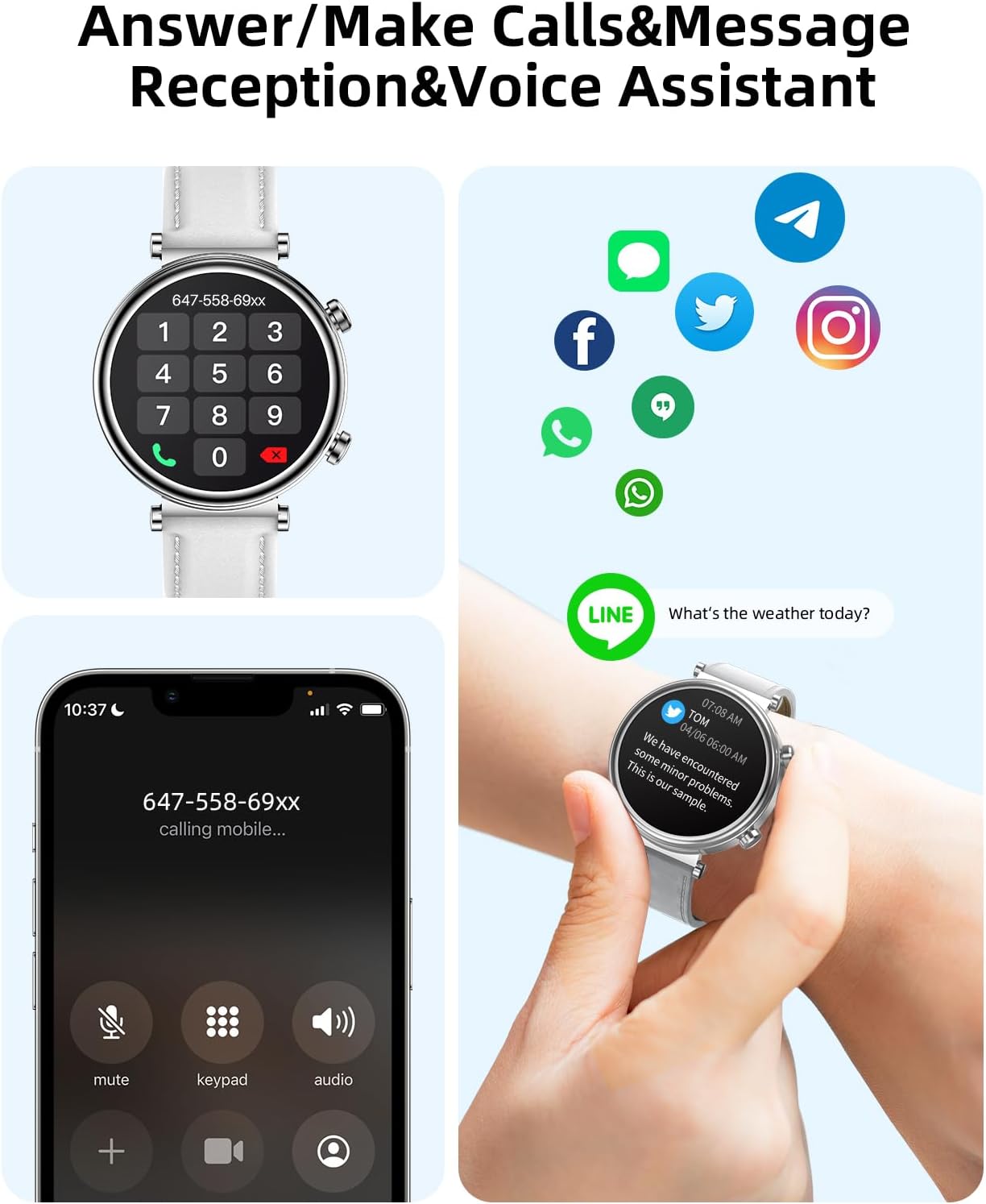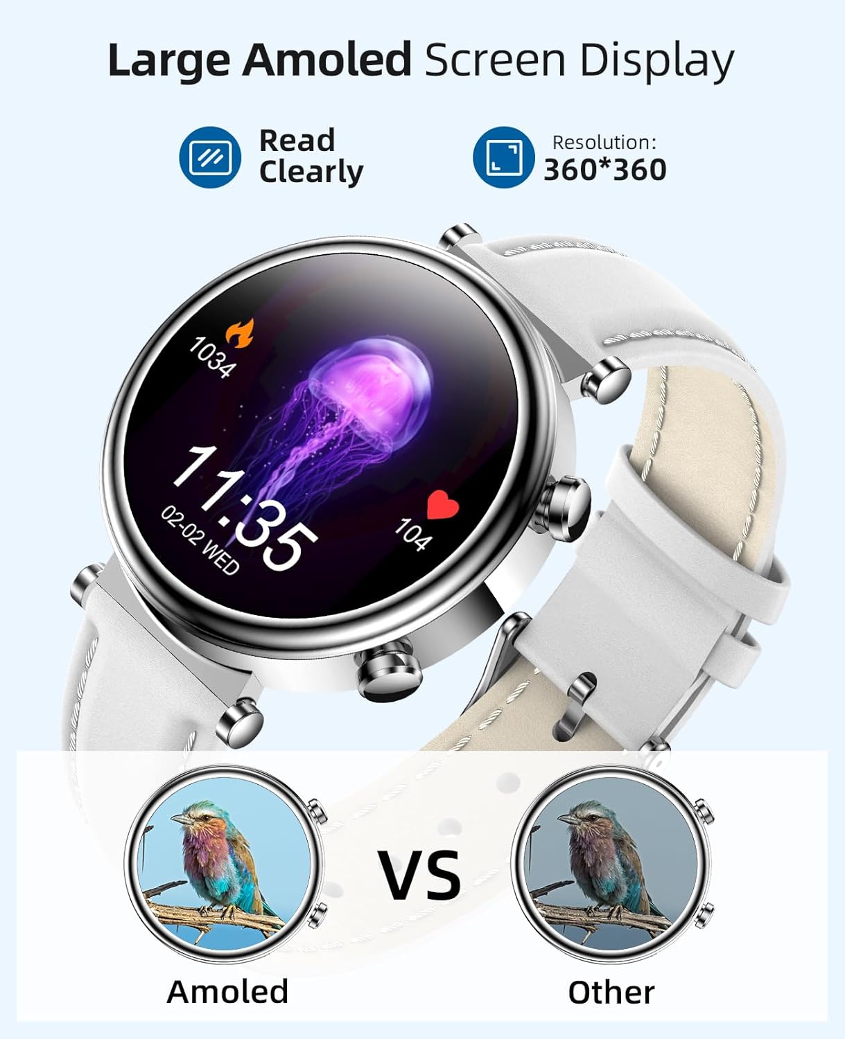 ⌚【1.27-inch Amoled display】The smart watch has a 1.27-inch full-touch large screen, and the 360*360 Amoled display screen provides an immersive visual experience, bringing a smooth touch and clearer picture quality. The women’s smart watch uses JL7012 low-power consumption chip, which enables faster and more stable data transmission, while saving you more power and allowing you to use it longer.