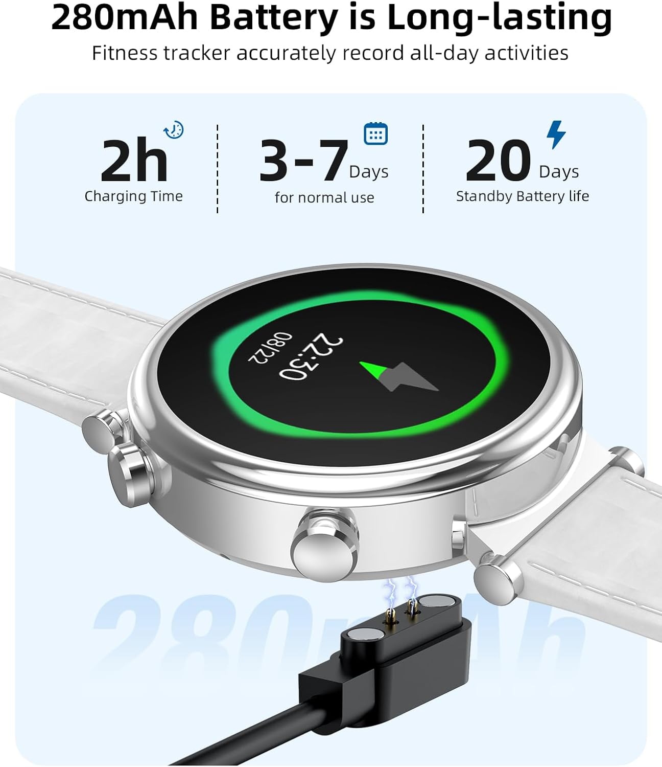 ⌚【Long Battery Life and Compatibility】This women’s smart watch is designed with low-power consumption chip and large-capacity battery. The battery capacity is 280mAh and the standby time is more than 20 days. A 2-hour charge can last up to 3-7 days. Our smartwatches are compatible with Android (A6.0+ and above) and iOS (11+ and above).
