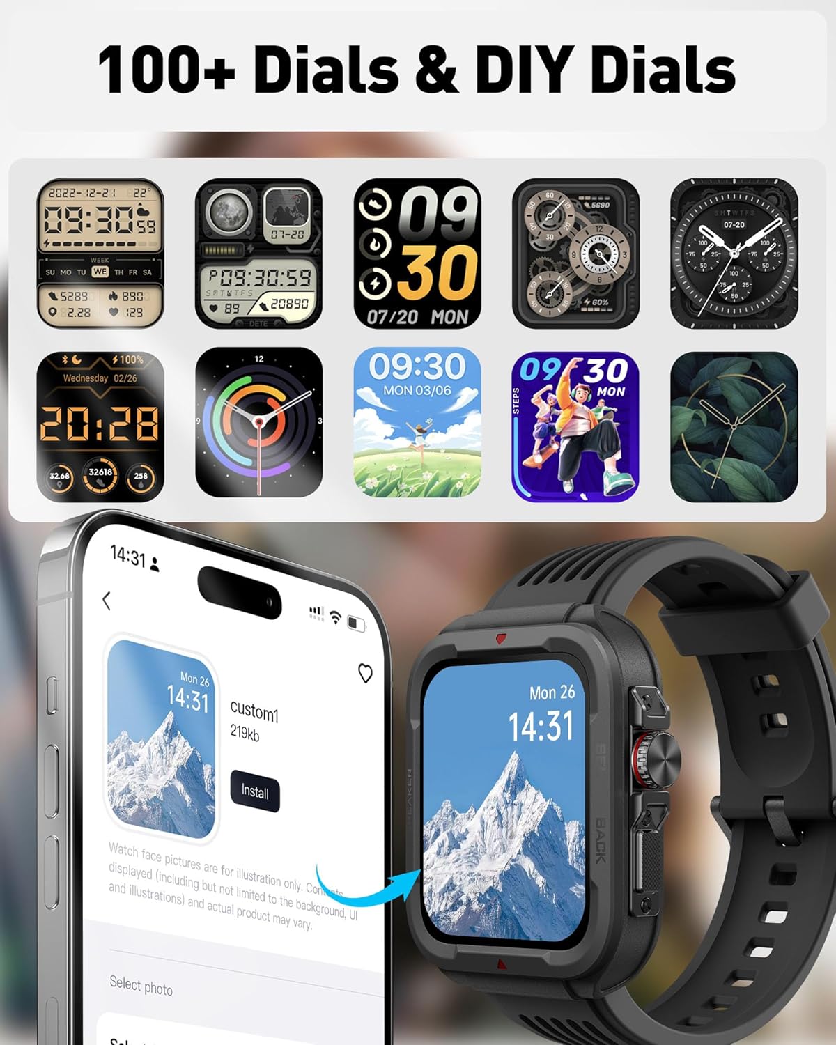 [1.8” Full Touch HD Screen & 100+ Dials] The smartwatch for Android iOS phones boasts a 1.8” full touch HD color screen, delivering excellent picture quality. It offers 100+ dials to choose from, allowing you to customize your watch face by uploading your favorite pictures.