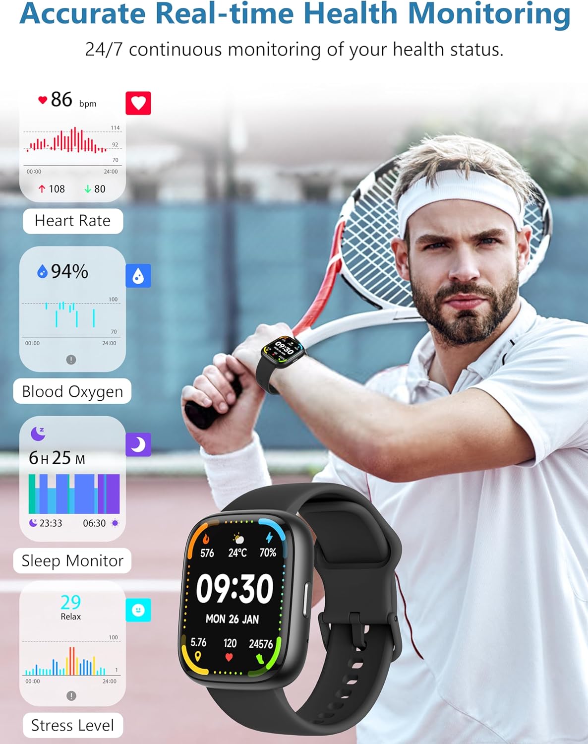 【24/7 Health Monitoring】The smartwatch has 24/7 heart rate and blood oxygen detection capabilities. Additionally, you can monitor stress levels on the watch and relieve stress with breathing exercises. The automatic sleep monitoring function allows you to understand your sleep status and gradually adjust your daily life to live a healthier life. The watch also has other practical functions, such as menstrual tracking for women, drinking reminders, walking-around reminders, etc.