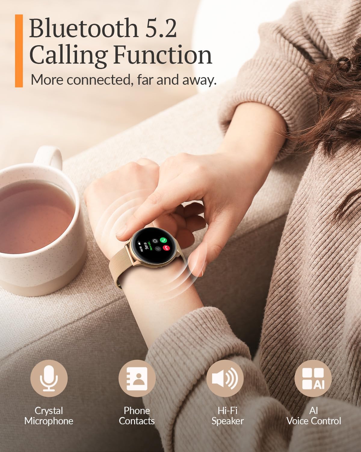 Effortless Bluetooth Calls: Enjoy convenient Bluetooth calls with the latest BLE5.2 chip, allowing you to answer, make, and reject calls directly from your smartwatch. And it can store up to 10 contacts and 100 call records. Stay connected with real-time message notifications from WhatsApp, Facebook, Skype, Snapchat, SMS, and more. The women watch also comes with a smart voice assistant that you can activate at any time.