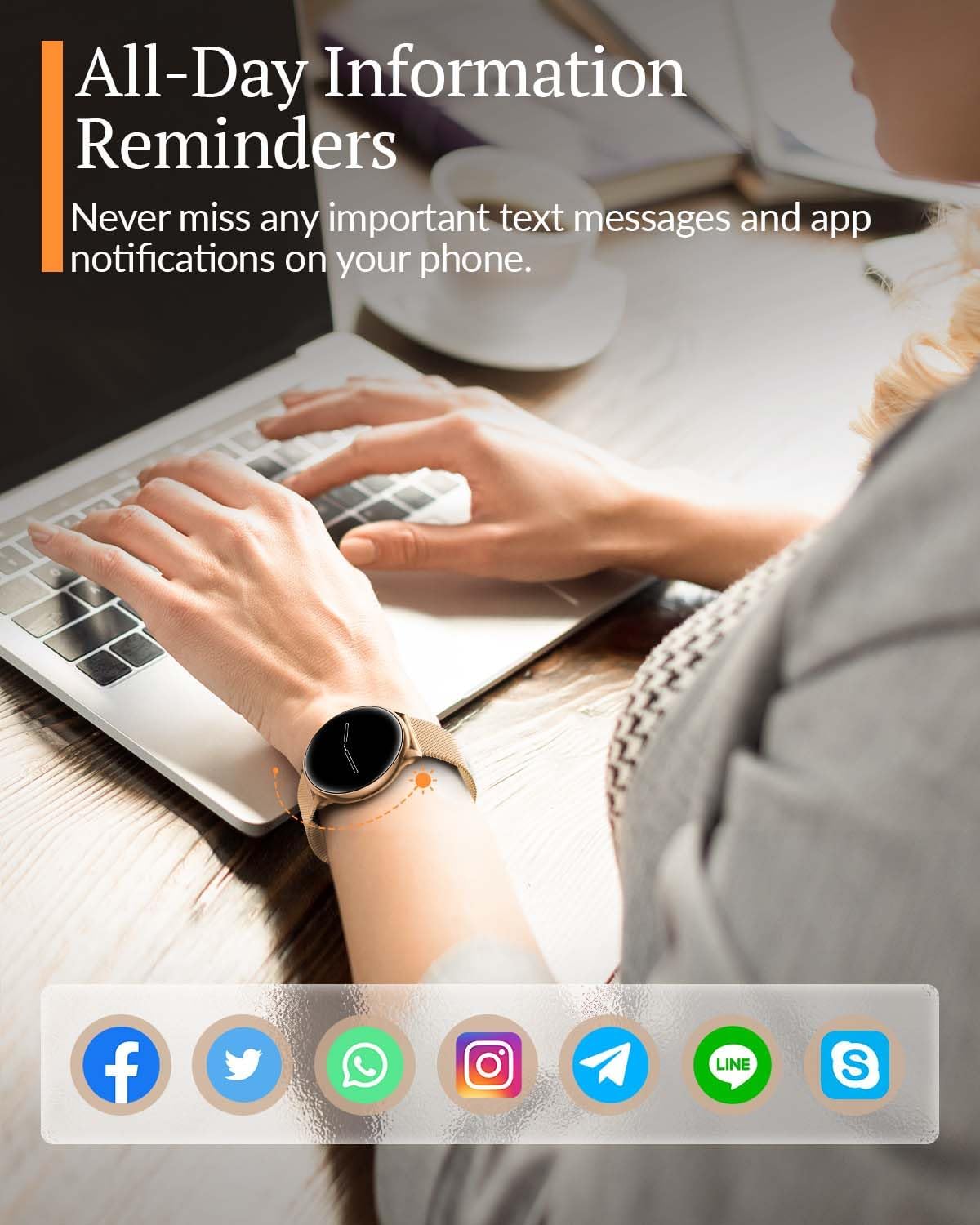 Effortless Bluetooth Calls: Enjoy convenient Bluetooth calls with the latest BLE5.2 chip, allowing you to answer, make, and reject calls directly from your smartwatch. And it can store up to 10 contacts and 100 call records. Stay connected with real-time message notifications from WhatsApp, Facebook, Skype, Snapchat, SMS, and more. The women watch also comes with a smart voice assistant that you can activate at any time.