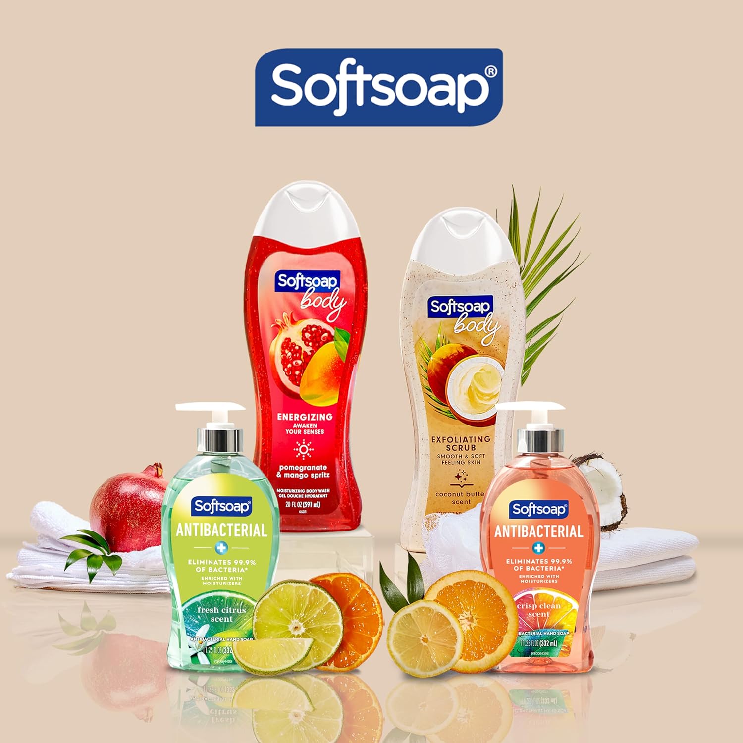 Softsoap Bundles are the perfect blend of luxury and efficacy. This 4-pack variety set includes our best-selling antibacterial liquid hand wash and luxurious body washes, all designed to enhance your daily cleansing routine while pampering your senses. Enjoy the Softsoap Antibacterial Liquid Hand Soaps in Crisp Clean and Fresh Citrus scents, each in an 11.25 oz bottle. These soaps eliminate 99.9% of bacteria (1) and are enriched with moisturizers. They are paraben-free, formulated without phthalates, and dermatologist-tested, ensuring your hands feel soft and clean with delightful, refreshing scents. Versatile to use in the kitchen or as a bathroom hand soap. The body wash bundle also features our Softsoap Energizing Pomegranate & Mango Spritz and Exfoliating Coconut Butter Scent Body Washes, each 20 oz. The Pomegranate & Mango moisturizing body wash invigorates with its energizing aroma, while the Coconut Butter body wash offers a luxurious exfoliating experience with crushed apricot seeds, leaving your skin smooth and softly scented. Both body washes are pH-balanced, made with biodegradable cleaning ingredients, and free from parabens and phthalates. This set provides effective cleansing and a luxurious indulgence, making it an ideal gift for any occasion. (1) in handwashing tests vs. the following harmful bacteria: S. aureus & E. coli
