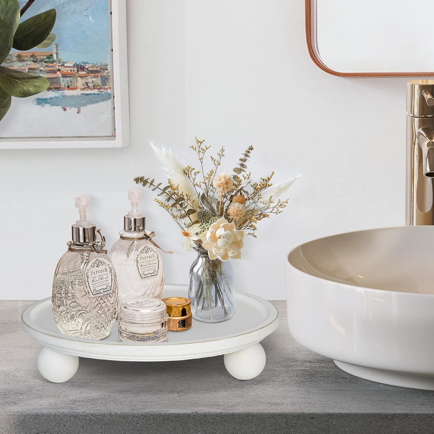 SOWA Farmhouse Round Wood Tray with Risers for Display, Wooden Decorative Tray for Kitchen Decor, Pedestal Stand for Countertop, for Soap Dish on Risers, Footed Rustic Cake Stand