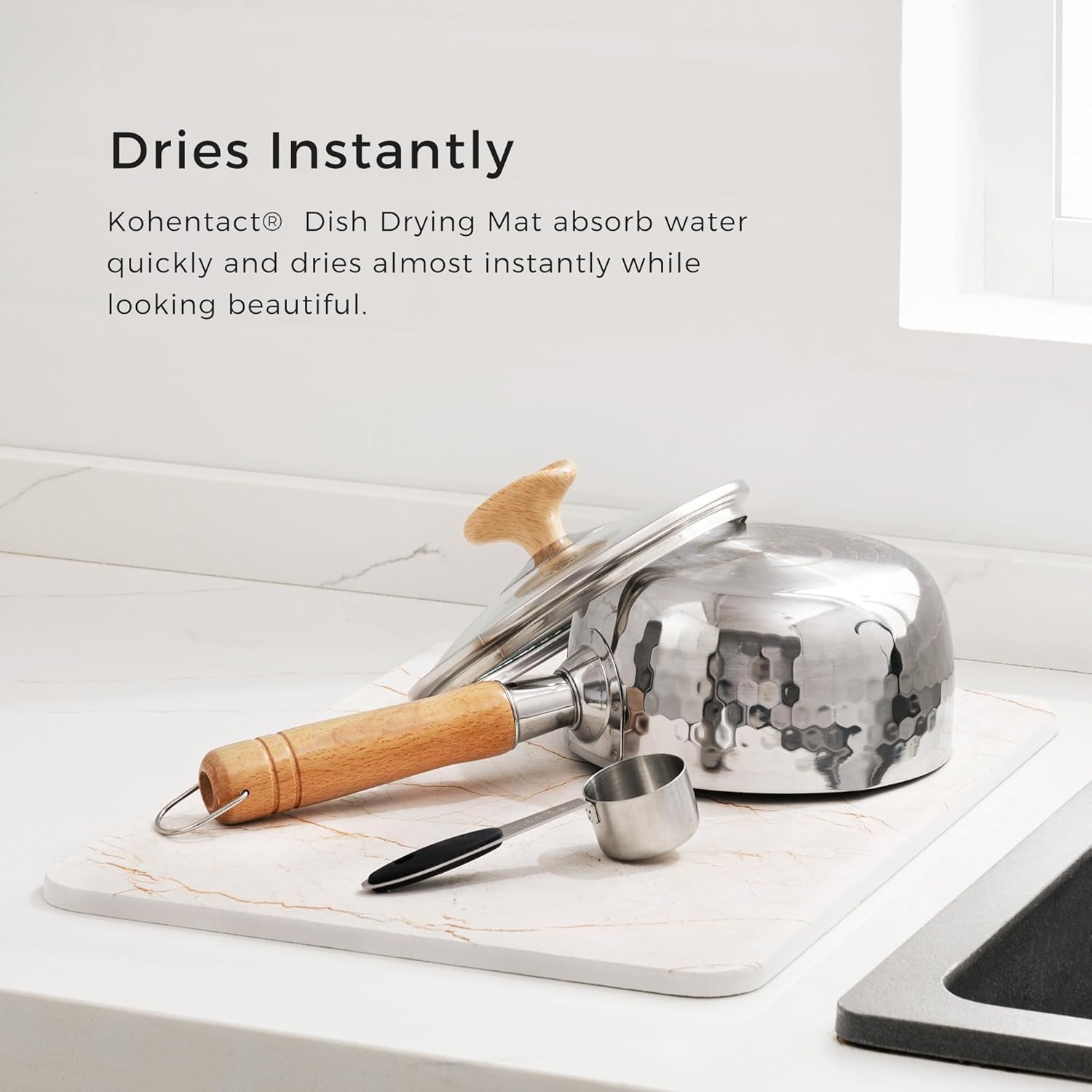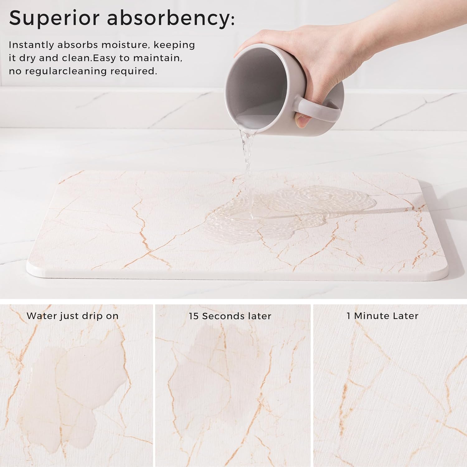 EXCEPTIONAL DESIGN: The design inspiration comes from the patterns of natural marble, ensuring there is always a style that perfectly matches your setting. Whether placed on tile, wood, quartz, bamboo, metal, or plastic surfaces, it pairs excellently, enhancing your unique lifestyle taste. The water remaining on the mat is absorbed and evaporates into the air at a visibly rapid rate.