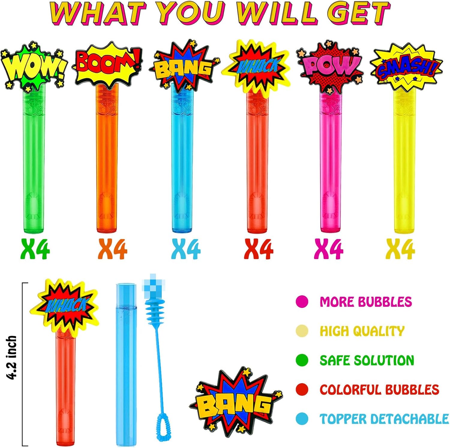 Colorful And Multi Pattern Design-Superhero word themed mini bubble wand has 6 colored bubble tubes and 6 different hero word patterns, which is very cool. And our bubble toppers are detachable, you can collect them or use them for other things, which is also a pleasure