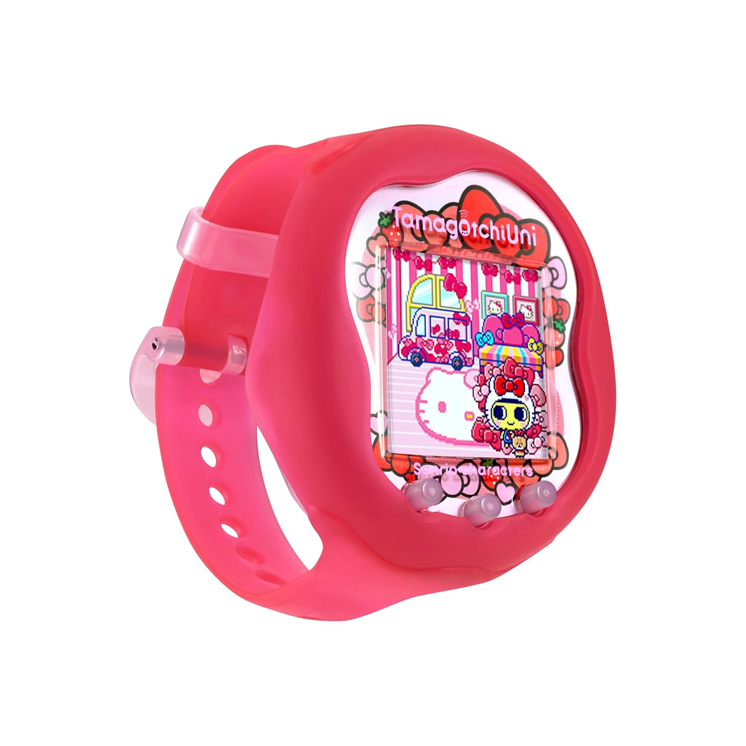 ACCESSORY. Wear it on your wrist with the included red band to take it with you wherever you go and to interact in new ways! Has a red shell with Sanrio design, translucent pink buttons and back