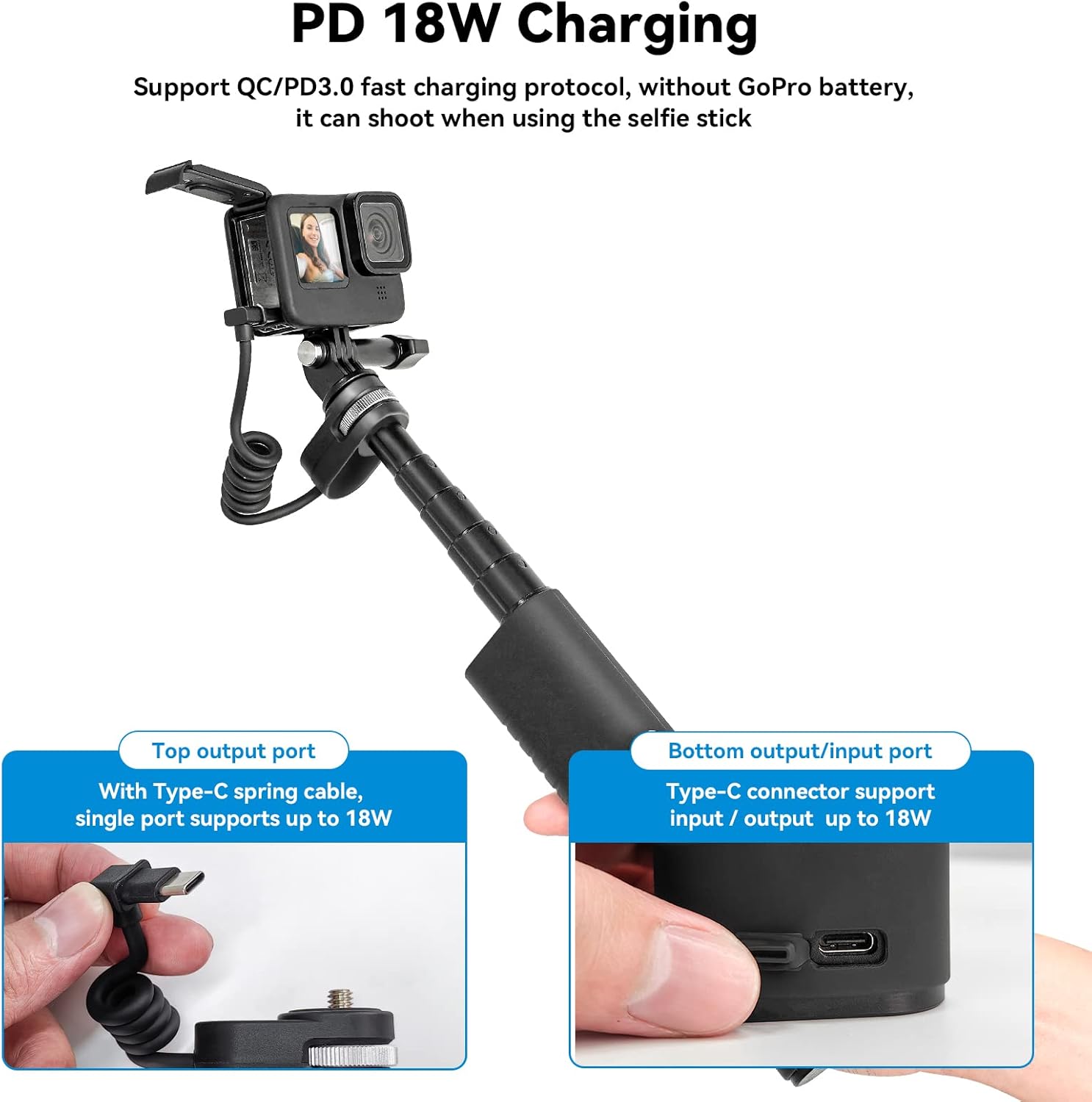 【Support Fast Charging 】 This selfie power handler support QC/PD3.0 fast charging, you can charge for gopro without a go pro battery, achieve charging while shooting simultaneously.