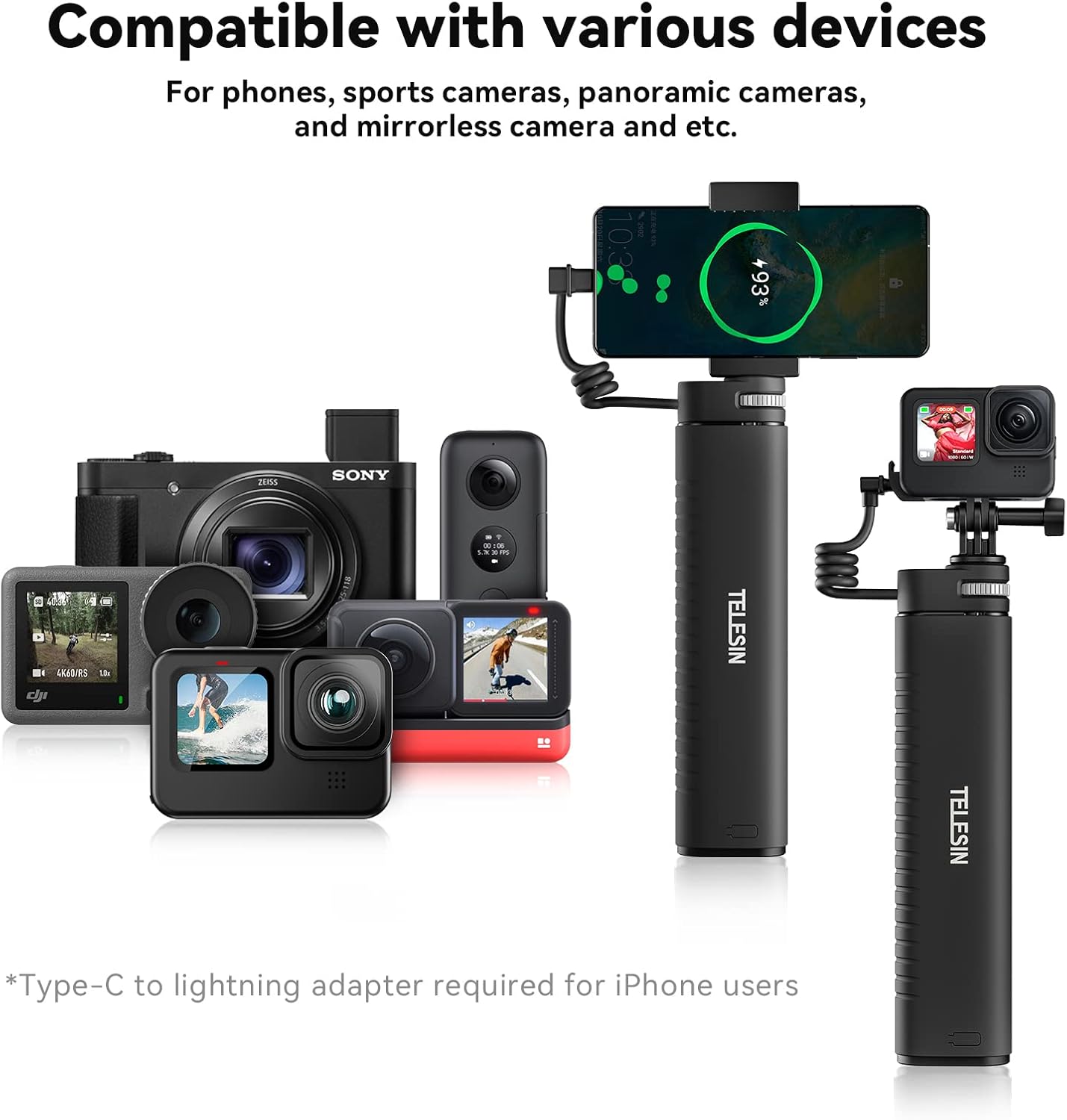 TELESIN Large Capacity Waterproof Extendable Power Grip 35.4″ Extension Selfie Stick Handler for Phone GoPro Max 11 Mini Hero 12 Hero 11 Hero 10 Hero 9 Black Hero 8 Hero 7 Hero 6 Hero 5 Insta360 One R RS Go2 Go3 X2 X3 Ace Pro, DJI Action 2 3 4 DJI Osmo Pocket 2 3, Canon Sony SLR camera iPhone Android Cell Phone Smartphone Mobile Phones Accessories