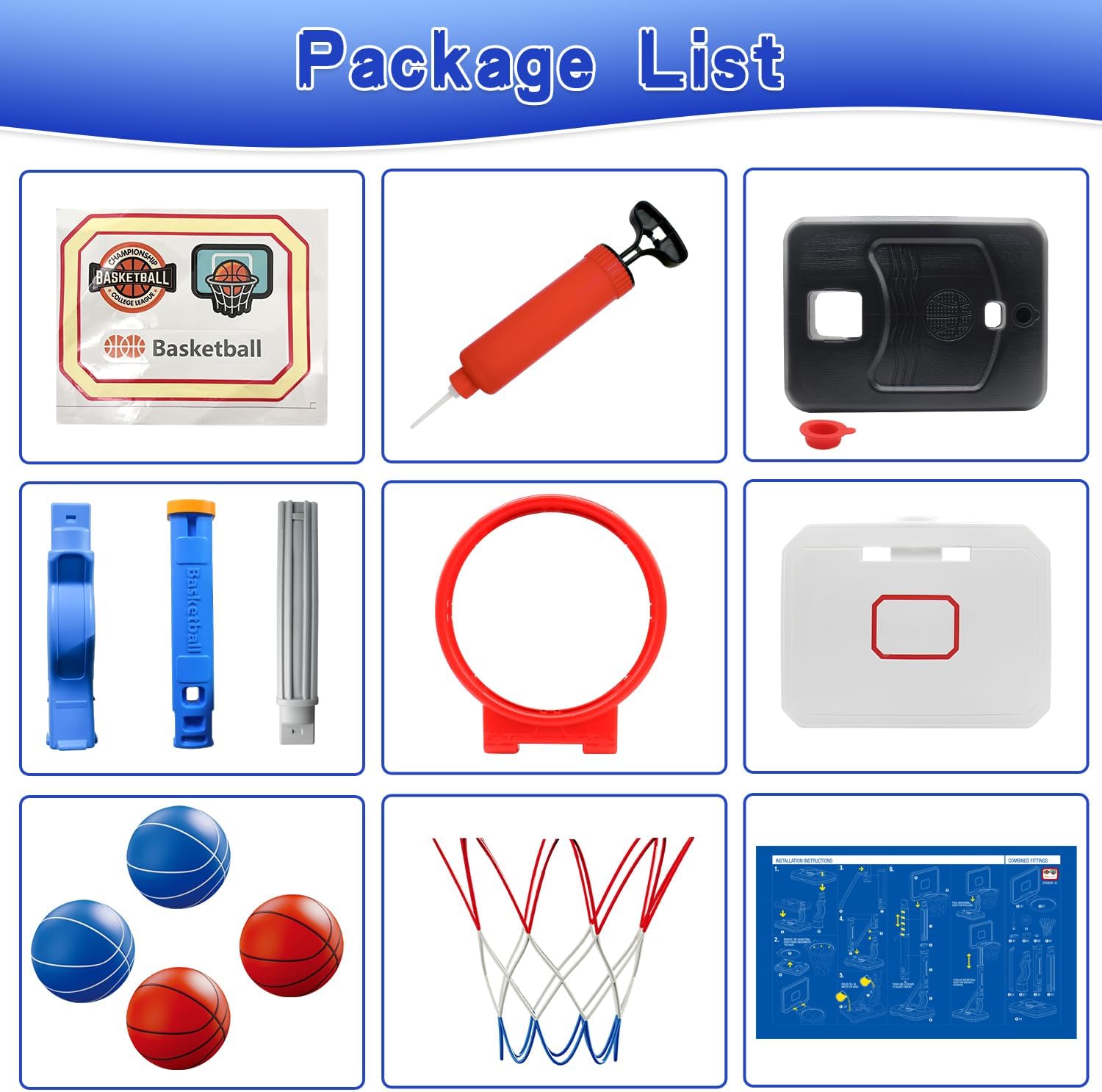 1 * stand basketball hoop3 * pole (switch between pool & indoor mode)1 * base(support fill with sand & water)4 * inflatable basketball(suit for multi-players)1 * net1 * pump1 * stickers1 * Installation Instructions(easy to assemble)