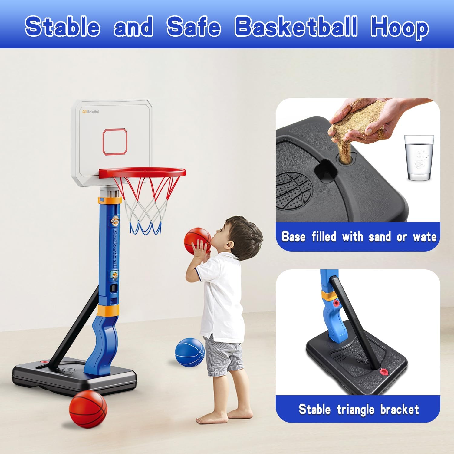 This toddler basketball hoop toy set is designed with indoor and outdoor use, so your child can play wherever they like. It’s great for use in the yard or at the park, and even for poolside fun! The set comes complete with four soft inflatable basketballs, making it easy for your little one to enjoy a game with their friends.With adjustable height options, your child can easily grow with this toddler basketball hoop set. The basketball hoop stands at a height that is ideal for little hands, and can be adjusted as your child grows taller. It’s the wonderful way to encourage your child’s love of sports from a young age.This baby basketball hoop is designed with safety and stable material, so you can rest easy knowing your child is playing with a durable and safe toy. The mini basketball hoop and ball are made with high-quality materials that can withstand regular use. with the triangular of support design, this mini basketball hoop set is stable and sturdy. You can also add water/sand to the base for even more stability.Looking for a fun and exciting Christmas or birthday gift for your little one? Kids will love playing basketball indoors and outdoors with this adjustable height basketball hoop stand, giving them hours of entertainment and exercise.