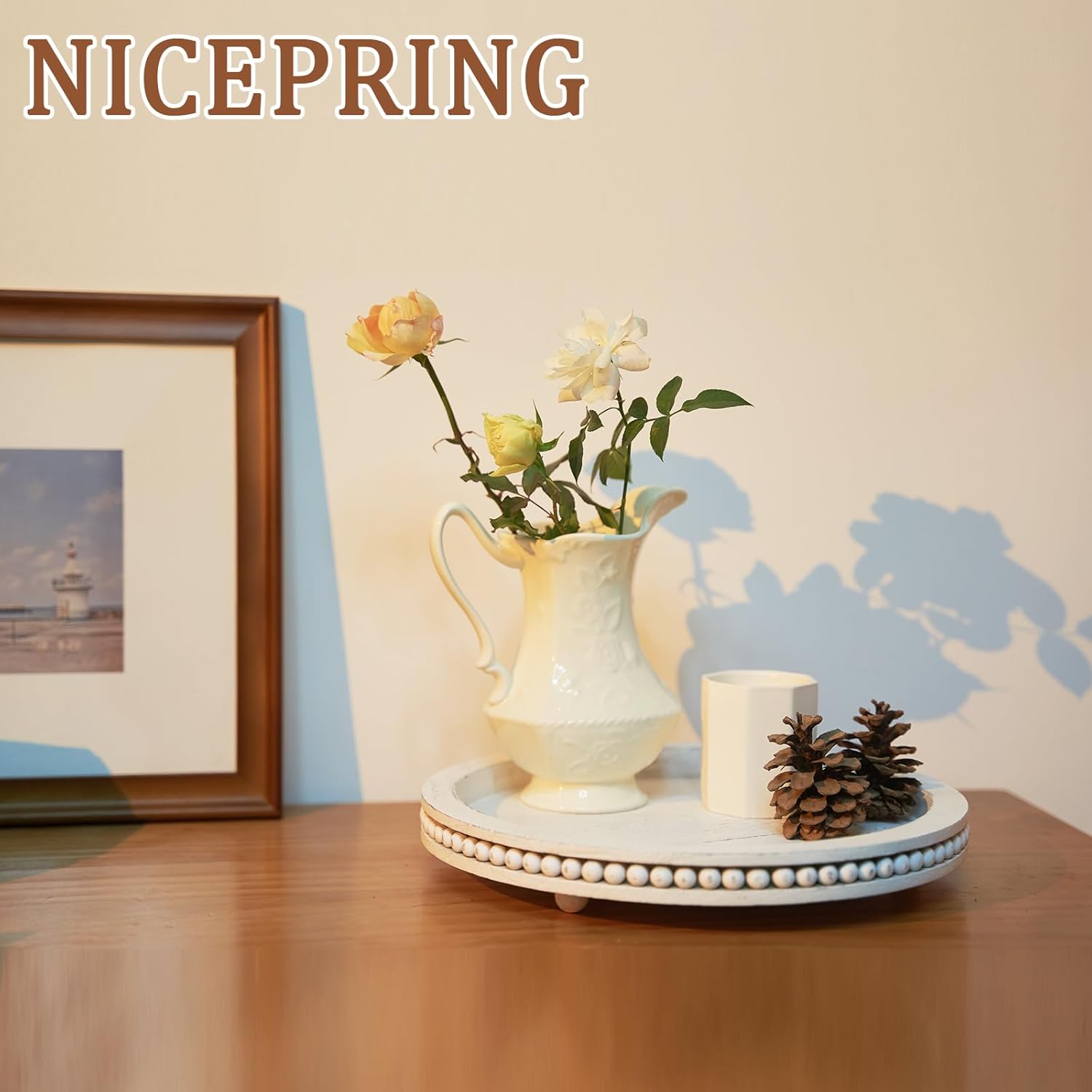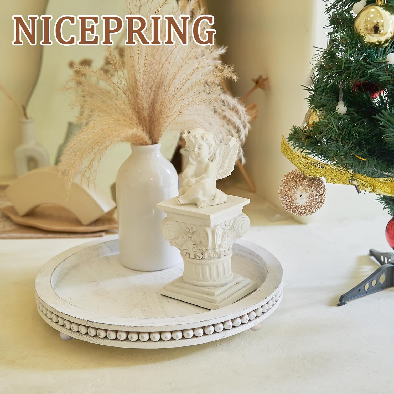 Tray Decor Table Trays Decorative – 12″ Beaded Round Trays Home Decor Rustic Farmhouse Table Decor Coffee Table Centerpiece White Wood Tray Decorations for Table Living Room Kitchen Bedroom