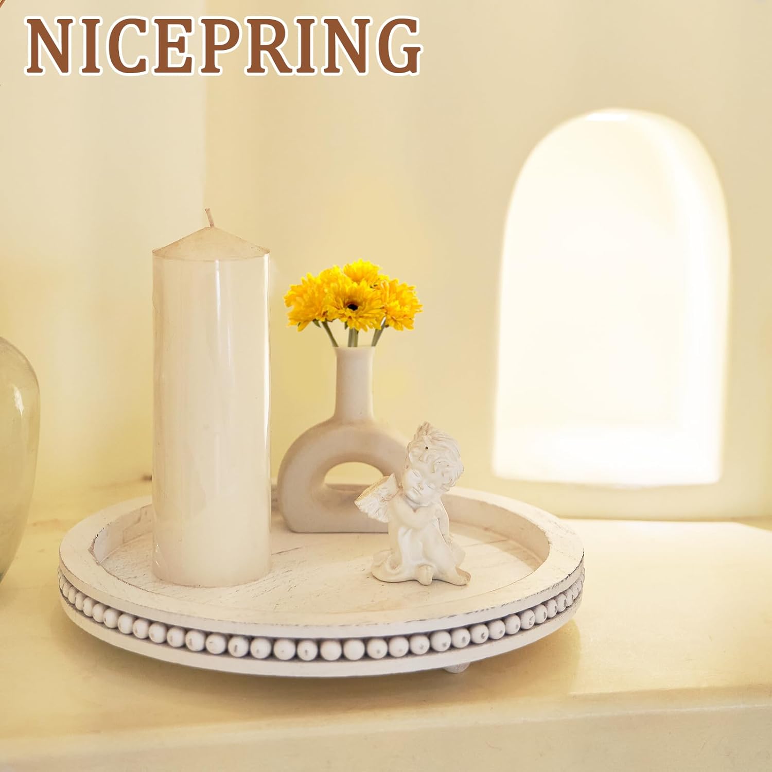 We carefully select natural wood materials, transforming them into exquisite pieces that seamlessly blend functionality with beauty. This white round wooden beaded tray is widely used as home centerpiece décor, coffee table tray, living room decor and accessories, kitchen table centerpieces and candle tray, ect.