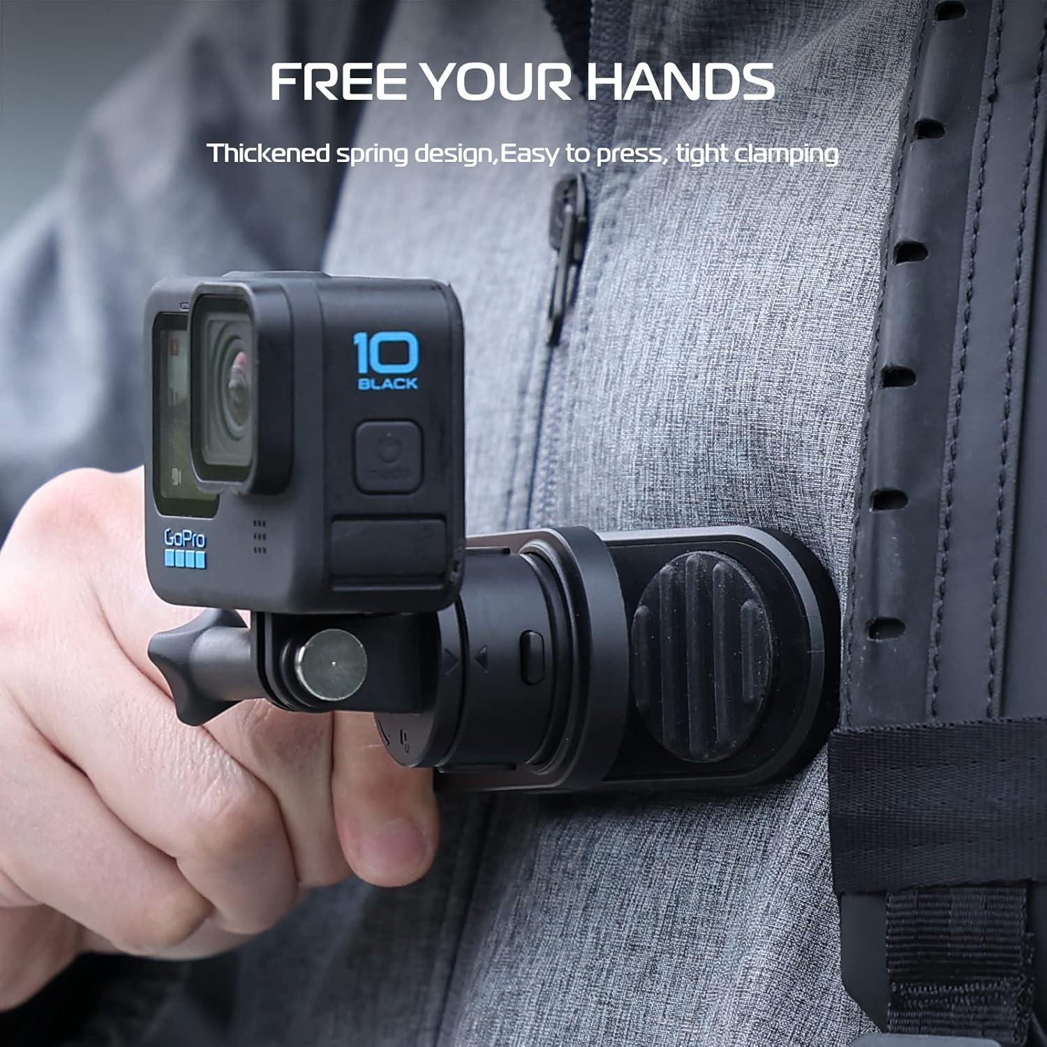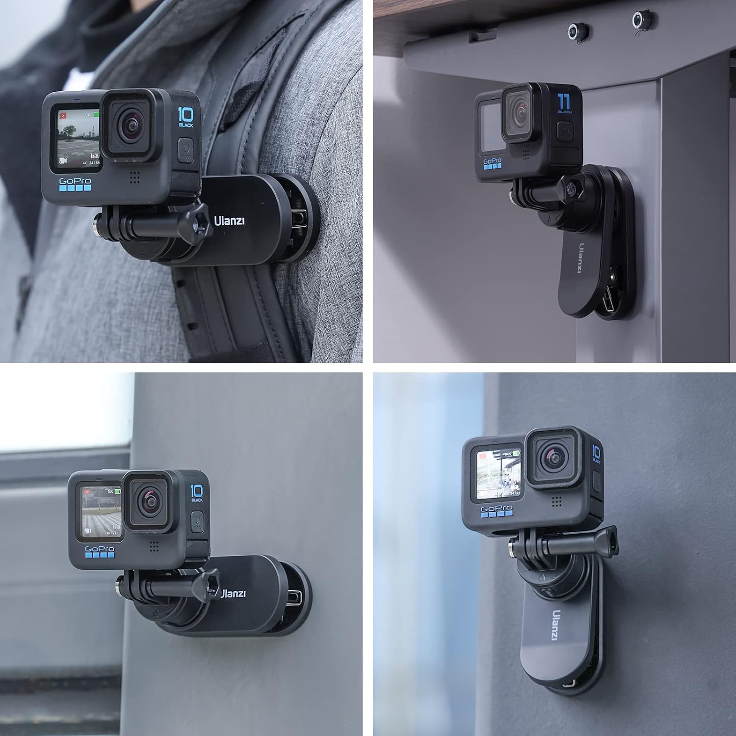 Strong Adsorption: This is the latest magnetic backpack clamp for gopro from ULANZI, it has a magnetic clip on the metal surface and a backpack belt clip bracket, the bottom of the clip is inserted into a magnet, which can absorb any iron products